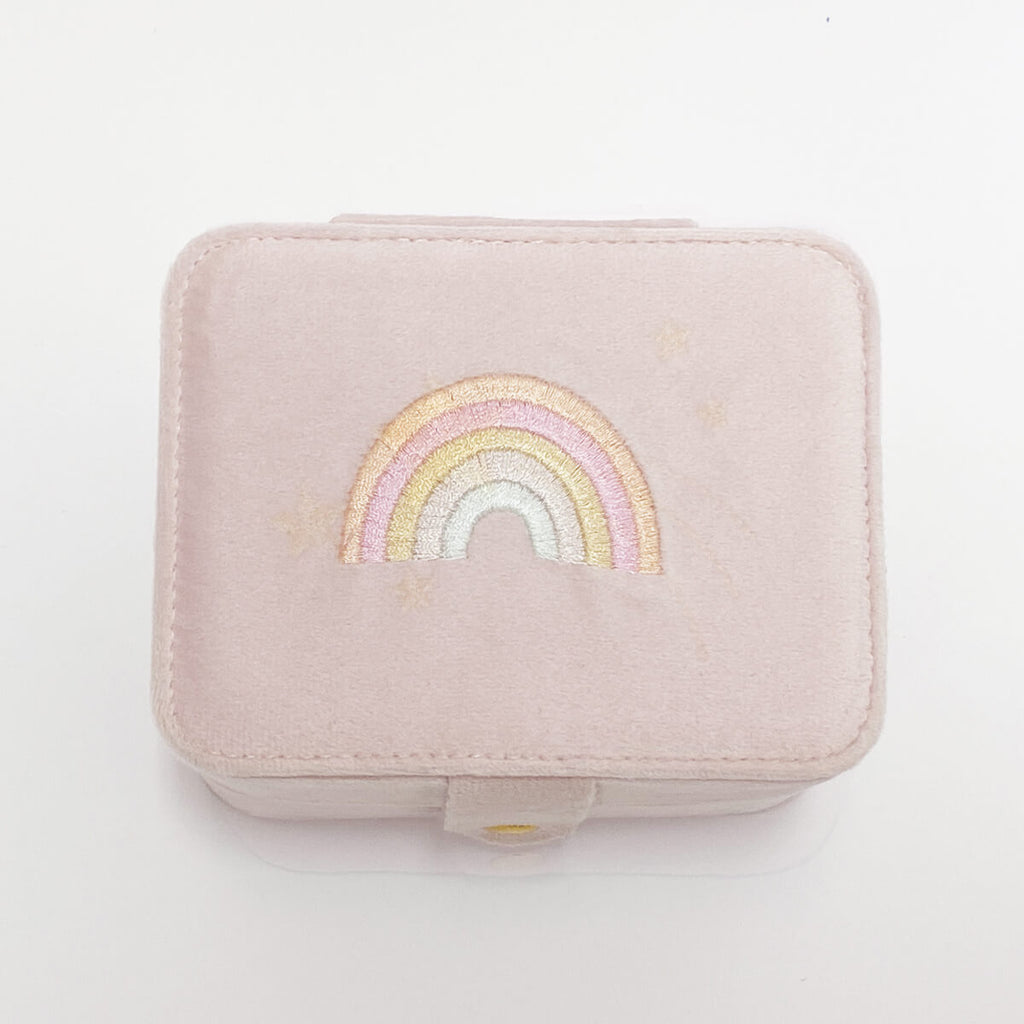 Dreamy Rainbow jewellery box by Rockahula. This gorgeous super soft velvet jewellery box is the perfect place to keep all your jewellery and favourite treasures safe. Featuring a beautiful embroidered rainbow on top, it has a popper fastening to reveal four compartments, a slip pocket and a dedicated space to slot earrings and rings.