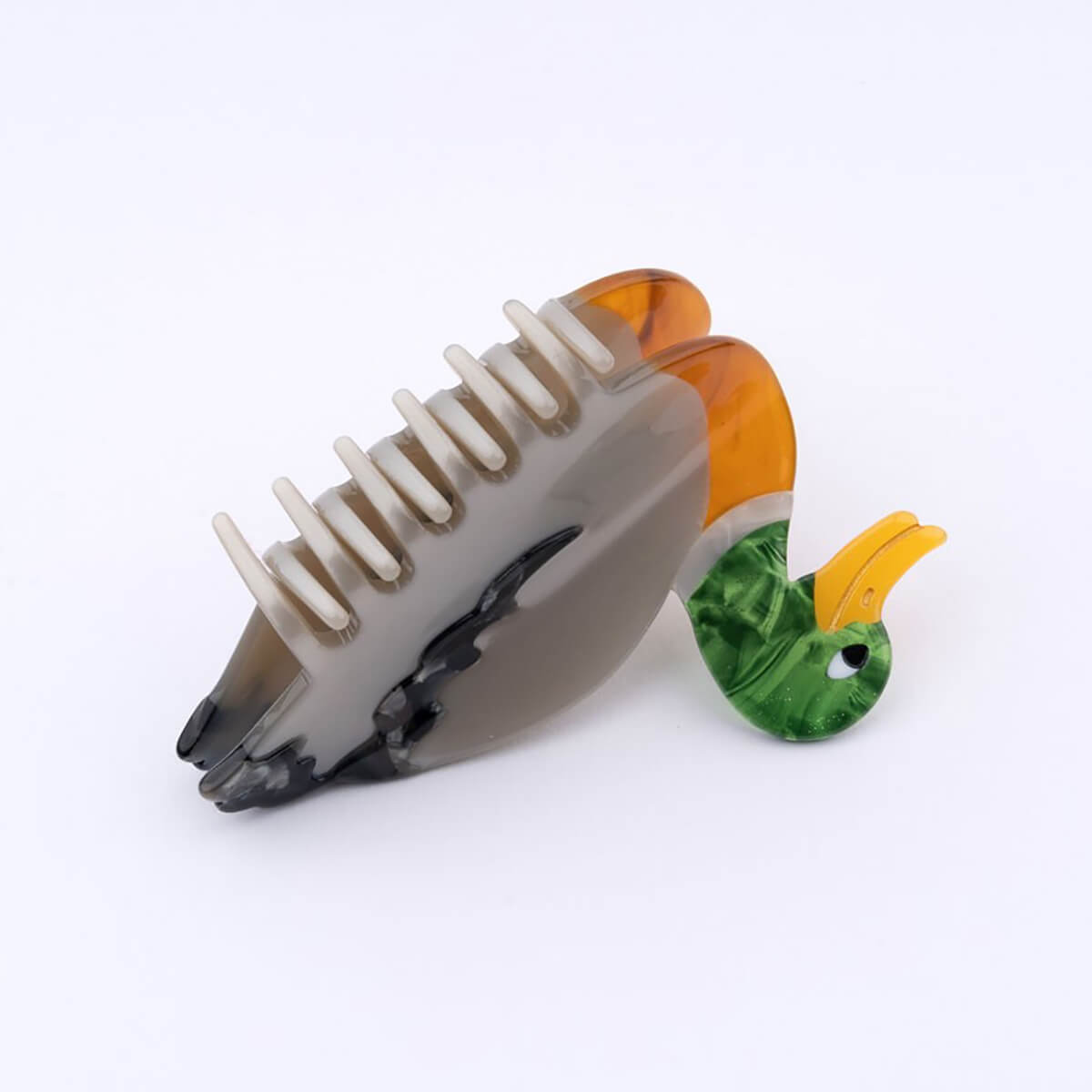 Duck hair claw by Coucou Suzette. Full acetate hair claw shaped as a cute duck. This mallard enchants us with its pretty emerald green head, brown chest and beautiful grey feathers. This original hair clip is sure to make those around us smile. Made from plant-based eco-friendly cellulose acetate.