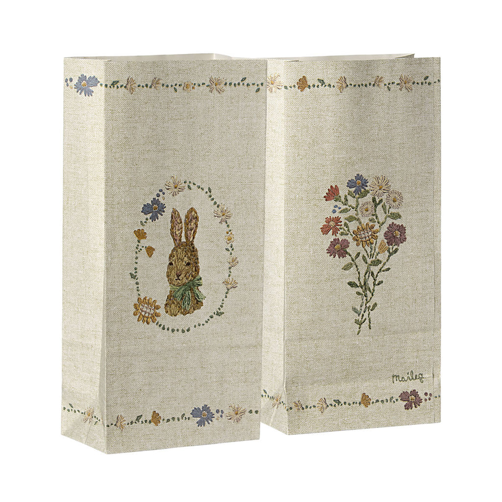Easter embroideries gift bag by Maileg. Easter is the time of small surprises for your loved ones. Use these paper bags for eggs, soft bunnies or any gift. The decoration on these bags started with Dorthe Mailil's personal embroideries and ended up as beautiful print. The paper quality complies with the food certificate standard.