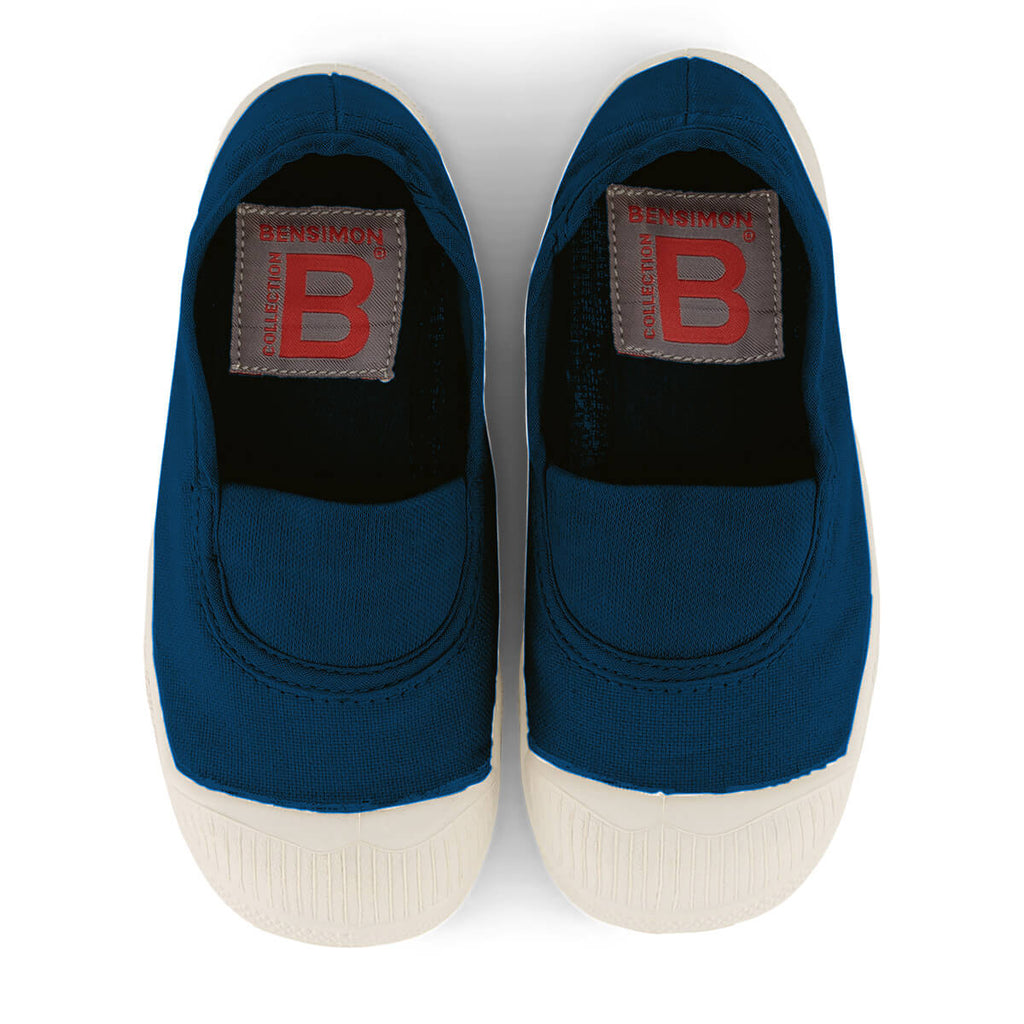 Elastic tennis shoe by Bensimon. Simple slip-on elasticated front version of the Bensimon tennis plimsolls. This slip-on style is easy to put on and quick to take off. Thin and lightweight sneakers made from rubber and natural cotton. Every shoe is hand-dyed in Bensimon's workshops in France, meaning every pair has its own variations and is completely unique.