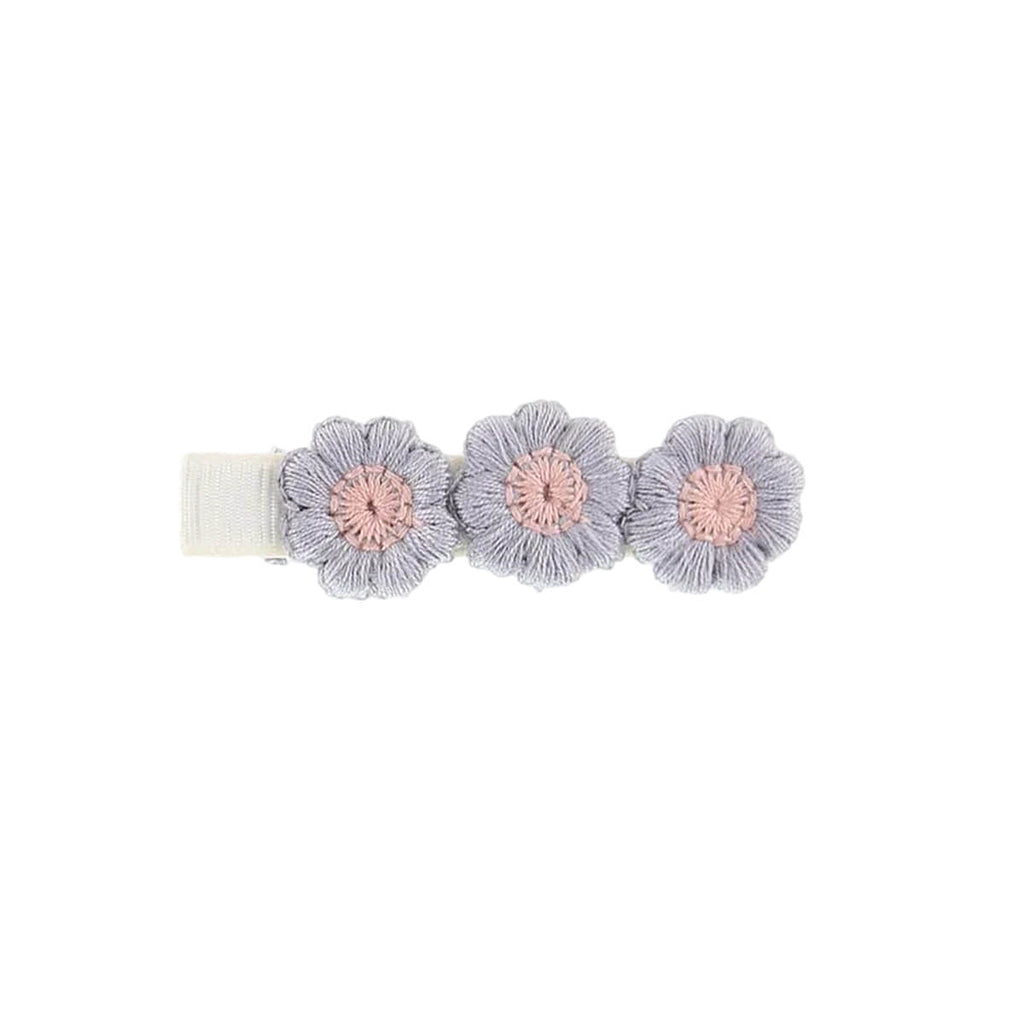 Embroidered Flower hair clip by Hello Sakura. Mini crocodile hair clip with three pretty and delicate embroidered flowers on a grosgrain ribbon covered silver tone crocodile clip.