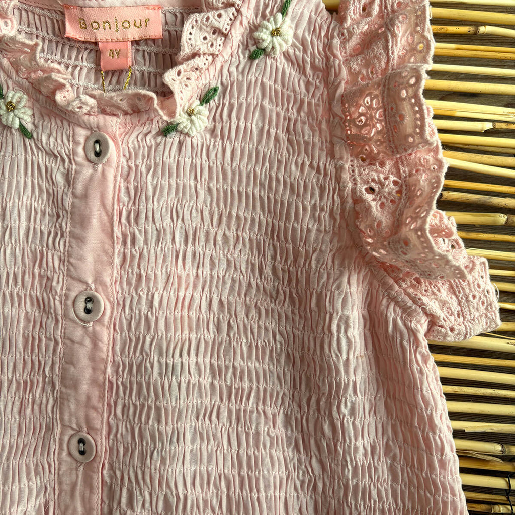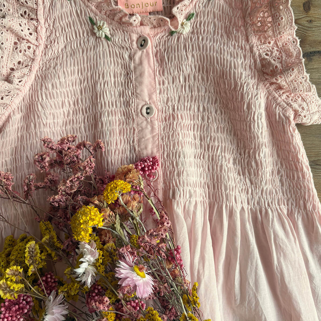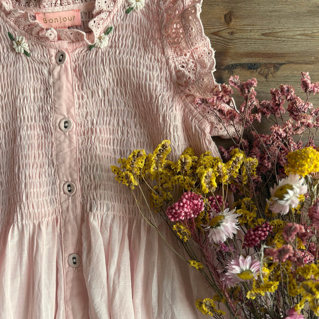 Ibiza Top by Bonjour. This beautiful blouse or dress in lightweight, breezy pink sushi voile has broderie anglaise frill edges on the shoulder. Bonjour's signature smocking on the chest and ivory embroidered flowers adorn the neck.