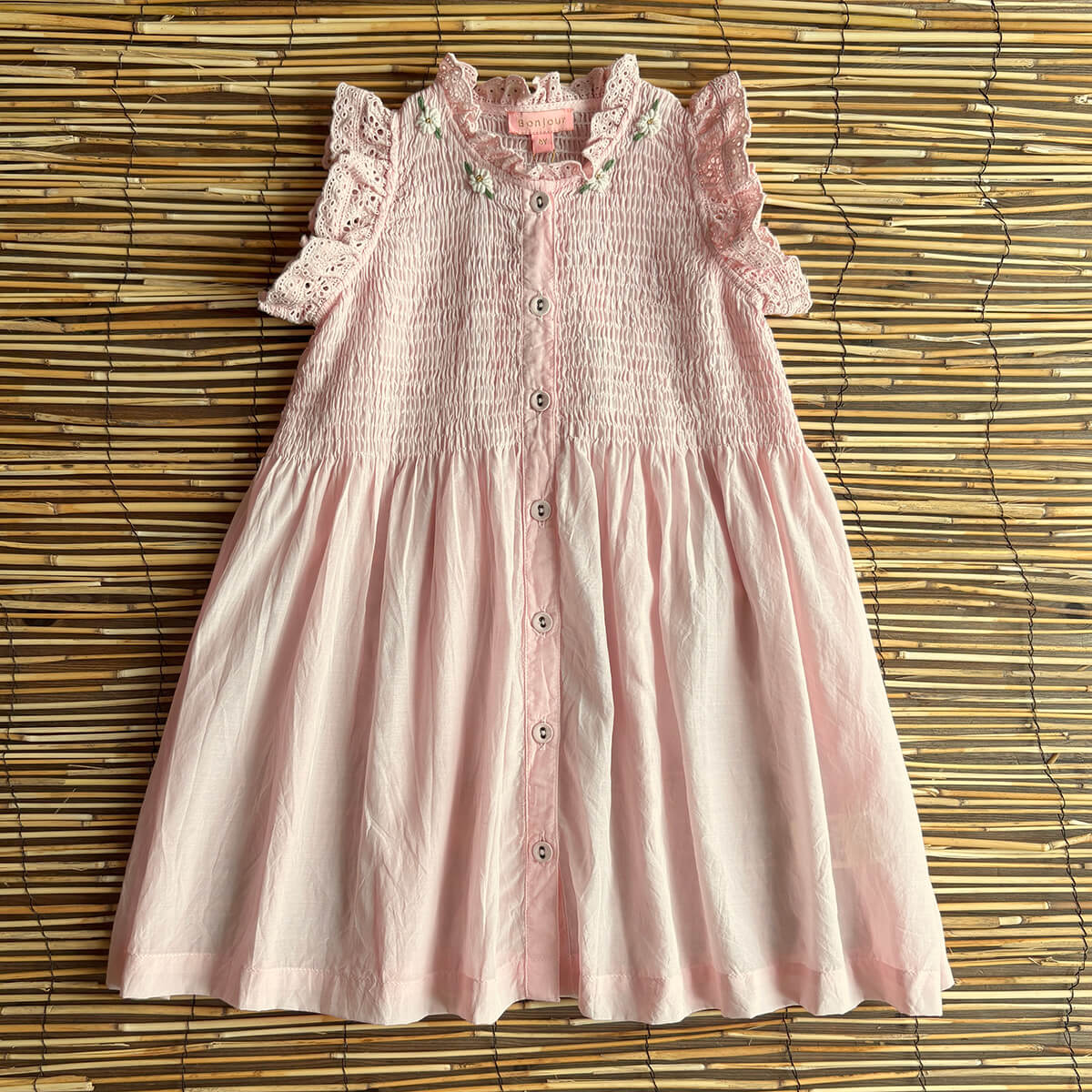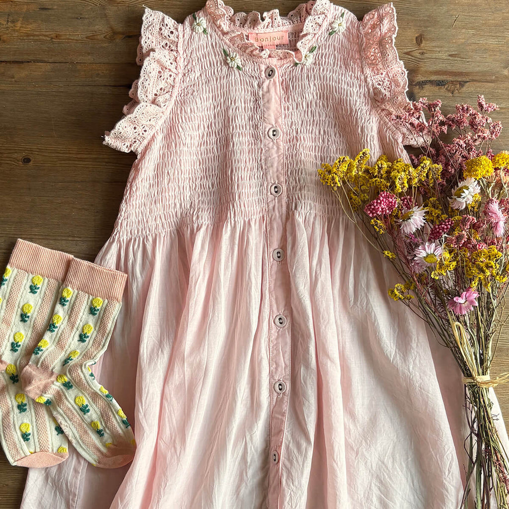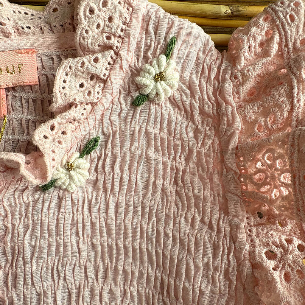 Ibiza Top by Bonjour. This beautiful blouse or dress in lightweight, breezy pink sushi voile has broderie anglaise frill edges on the shoulder. Bonjour's signature smocking on the chest and ivory embroidered flowers adorn the neck.