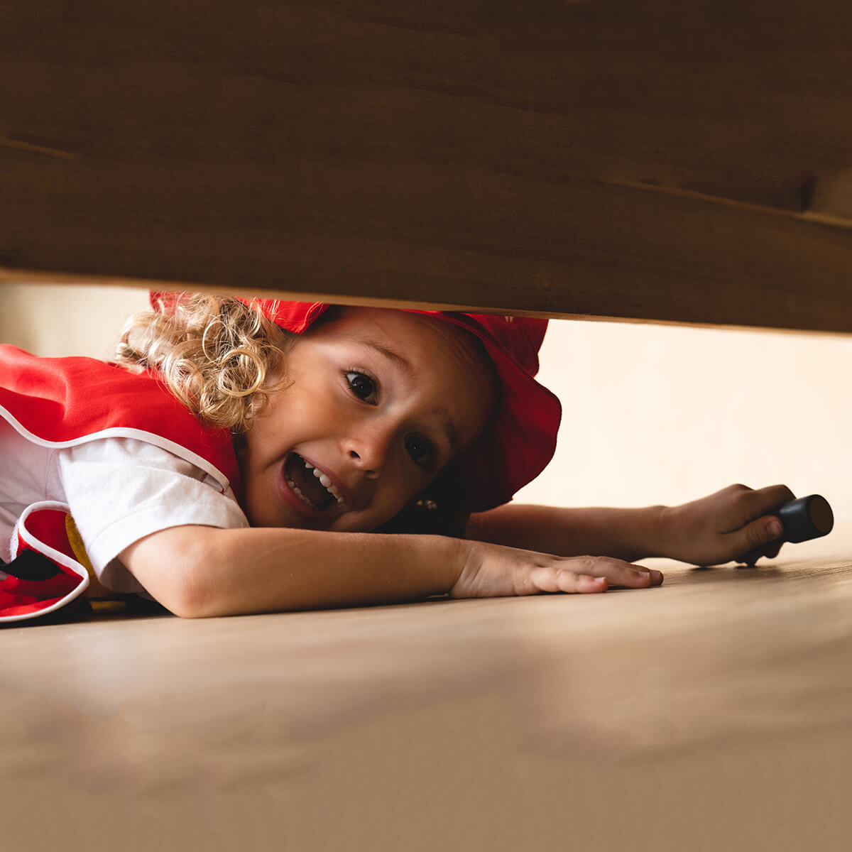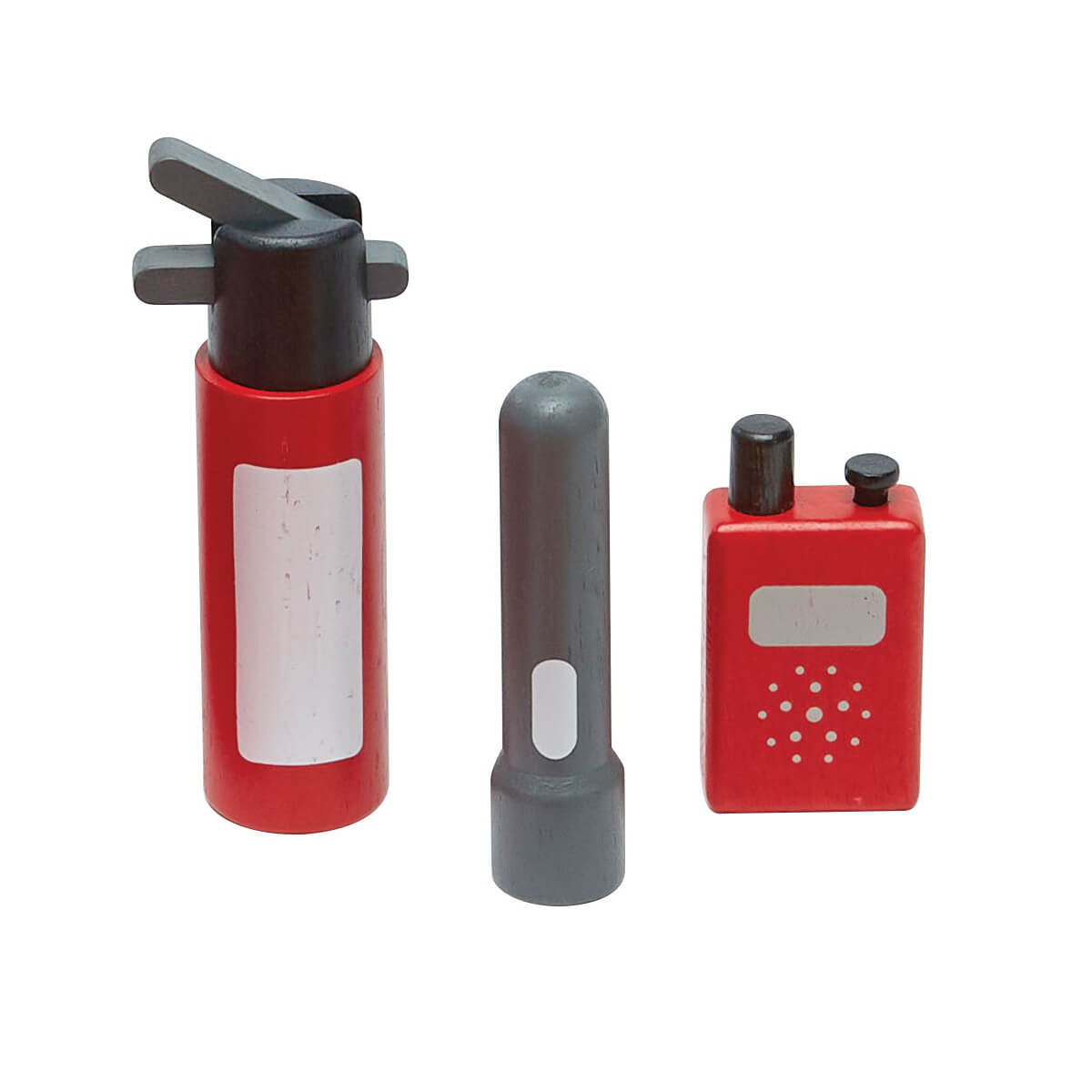 Firefighter play set by PlanToys.  Firefighters are our everyday heroes! This play set invites children to explore the daily duties of a real fire fighter. The set features an adjustable helmet and jacket, megaphone, fire extinguisher, water hose, flashlight, hatchet and walkie talkie. Tackle nearby emergencies and discover what it's like to be a real fireman!