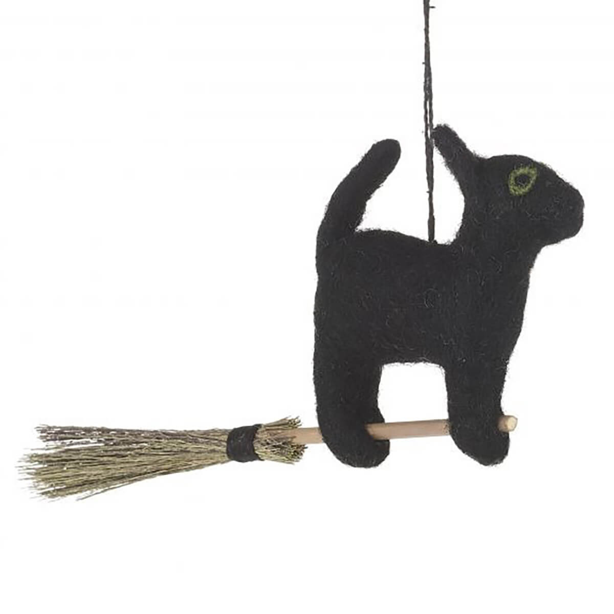 Flying Black Cat felted Halloween hanging decoration by Felt So Good. This naughty black cat thought it was a purr-fect day for flying, so she hopped on a Witches broomstick and took to the night sky! Made using traditional needle felting techniques.