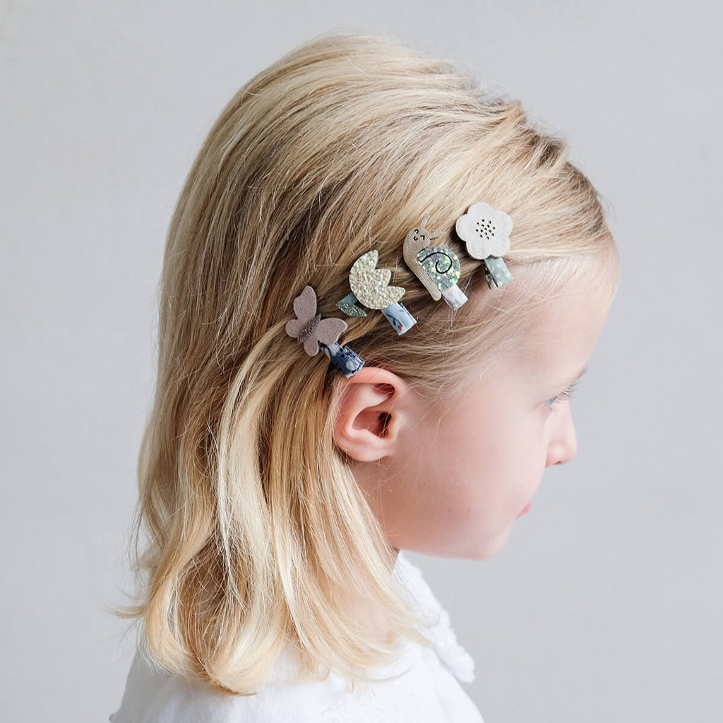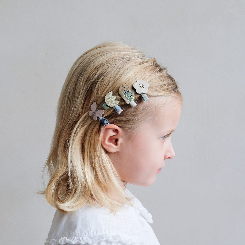 Garden Mini Hair Clips by Mimi & Lula. Budding gardeners and outdoor lovers alike will go crazy for these lovely sparkly mini alligator hair clips. Featuring snails, butterflies and flowers intricately crafted from soft leatherette glitter, metallic and plain fabrics.