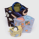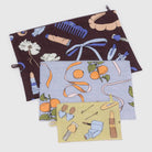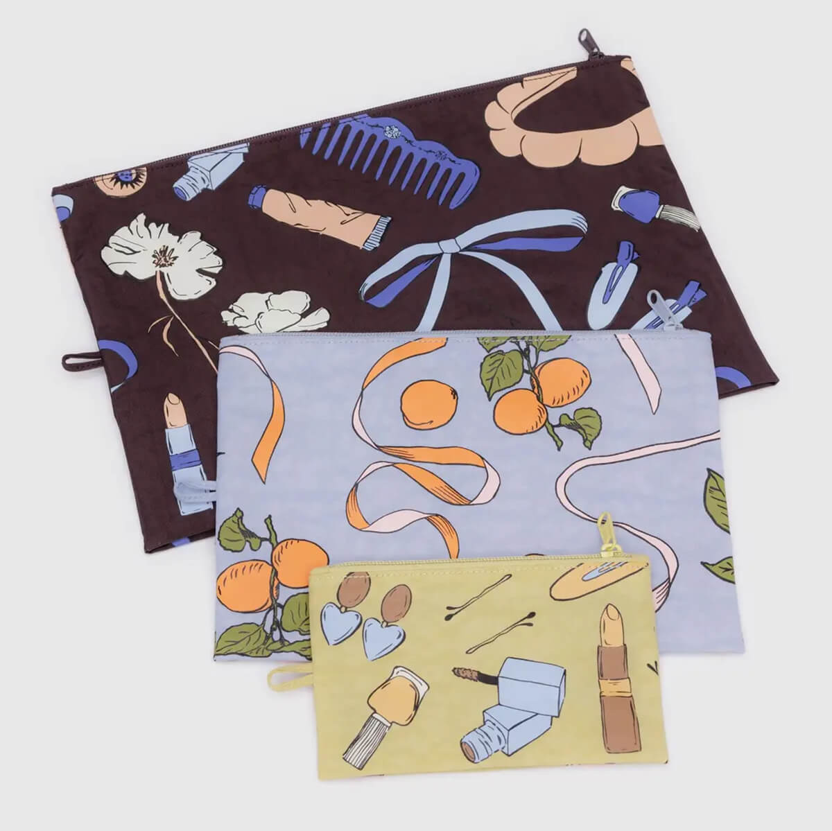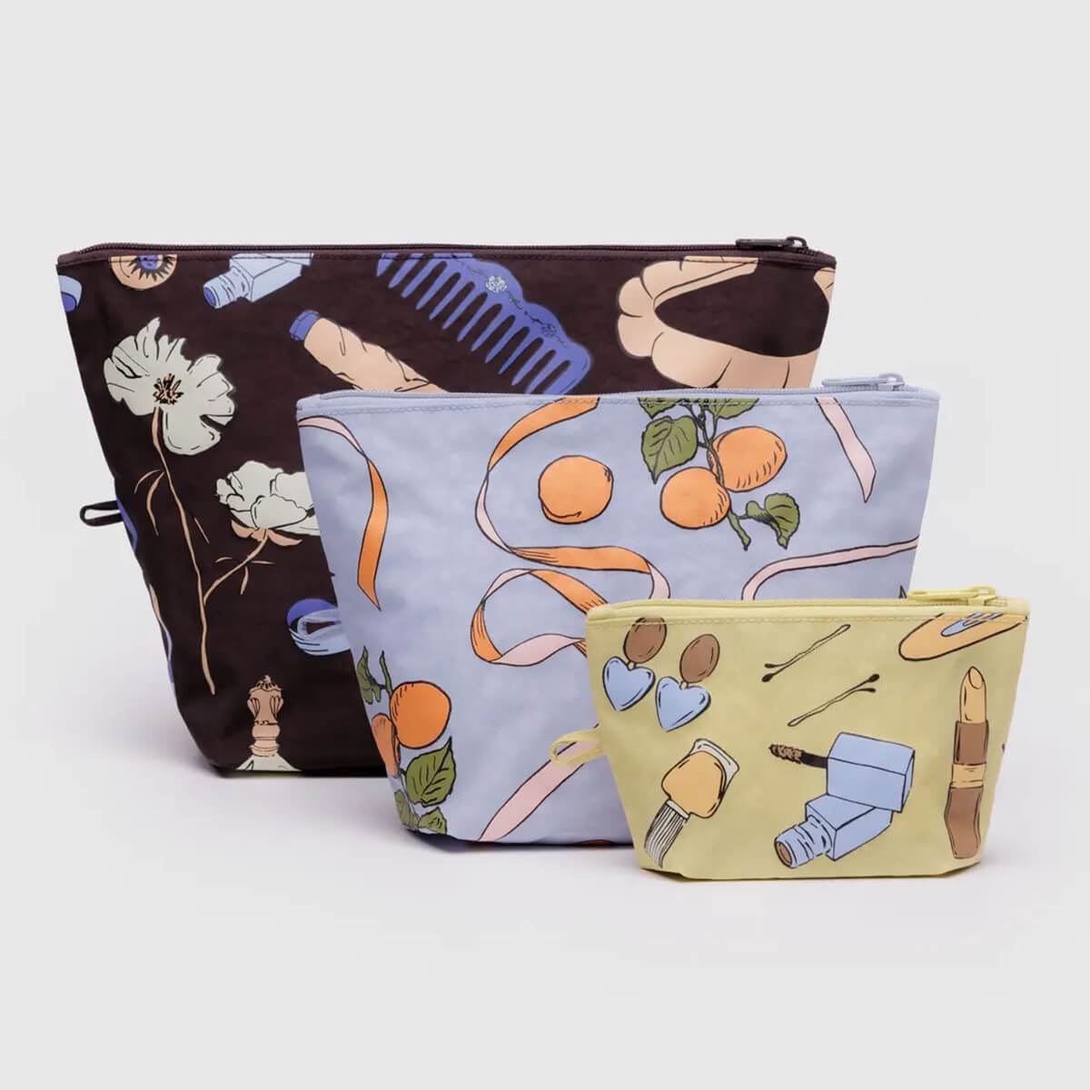Go pouch set by Baggu. The Go Pouch Set makes it easy to keep your bag neatly packed and organised. Whatever you're carrying — coins, cables, or an extra pair of shoes — this set of three all purpose pouches keeps it together. They expand to hold your essentials and fold flat when not in use.