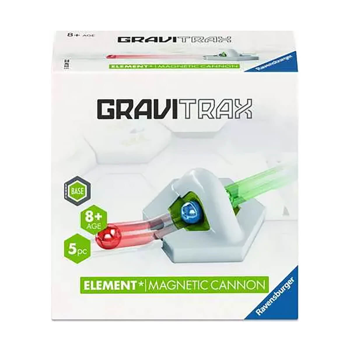 Gravitrax Element Magnetic Cannon by Ravensburger. Launch your marble through your run with the amazingly powerful “GraviTrax Magnetic Cannon”! Simply place two marbles in front of the “Cannon”; when your marble hits, it sends the front marble blasting down the track! A high-powered magnet gives the marble a burst of speed to help extend your run up inclines and down tracks. A great addition to any “GraviTrax Starter-Set”; comes with 3 additional coloured marbles.