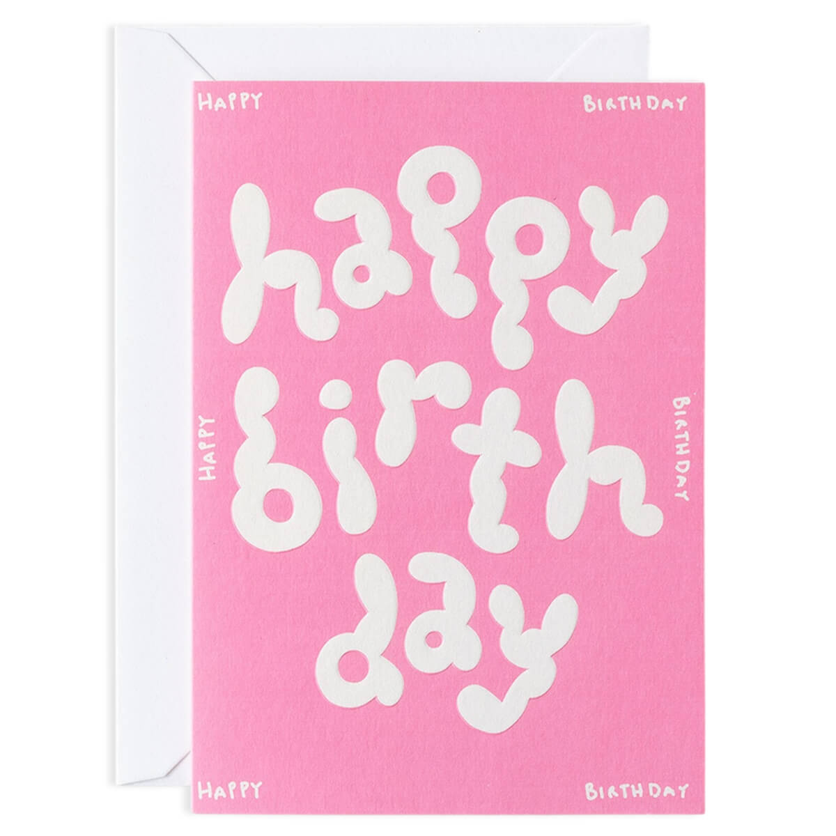 Happy Birthday embossed greetings card by Micke Lindebergh for Wrap. A type-based birthday card designed in a party pink hue and finished with embossed writing and details. Blank inside with plain white envelope.