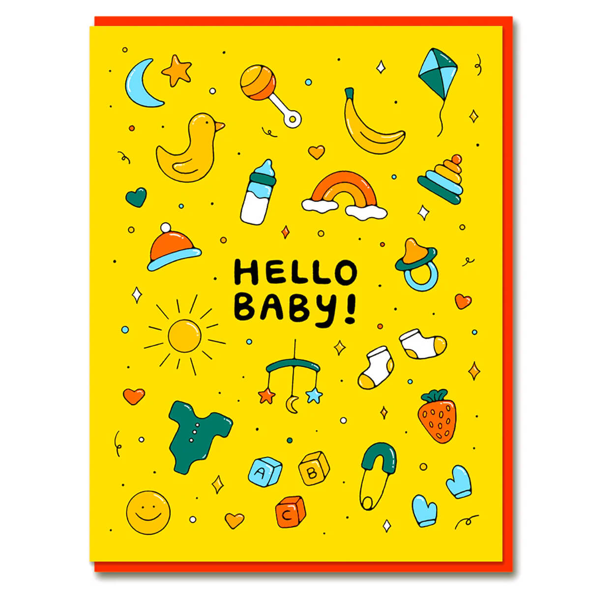 Embrace the sweet chaos of babyhood and say a cheerful 'Hello Baby' to the new bundle of joy in this bright new world. A playful patchwork of baby wonders, and just take a peek at those adorable little socks! The sweetest welcome to the tiniest toes.