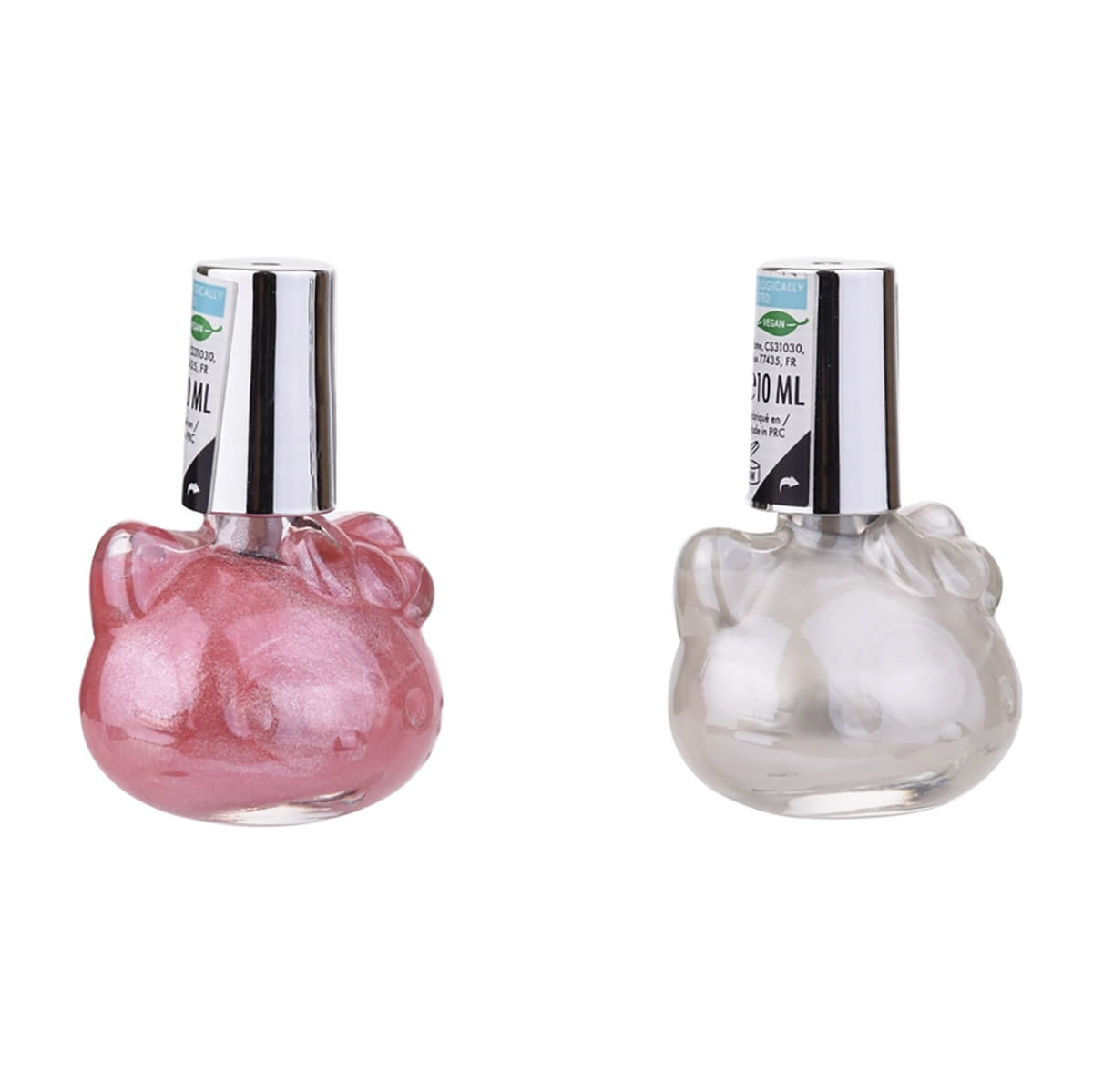 Hello Kitty Water Based Nail Polish by Take Care. With Hello Kitty, your nails will never stop shining! These super cute wash-off nail polishes come in an iconic Hello Kitty shaped bottle in your choice of colour: Pearly Pink or Pearly white.