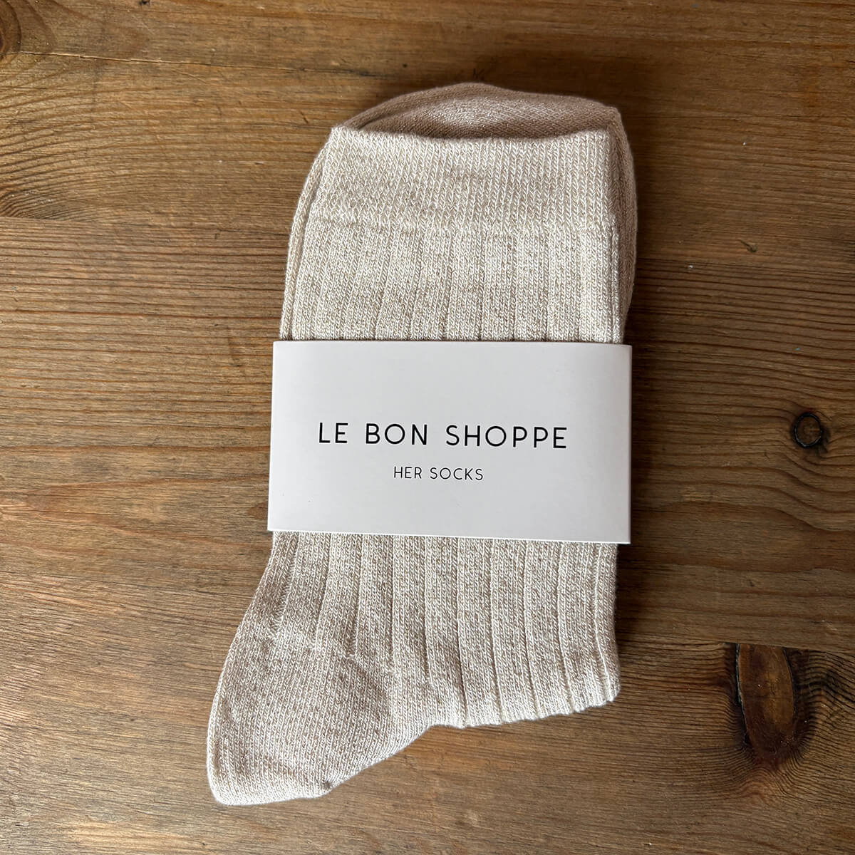 Her socks by Le Bon Shoppe. A little sparkle goes a long way. When we are feeling a little extra, this glittery version of the OG Her Socks is our go to gal. Now in a super soft and supple modal blend yarn, these are the perfect height ribbed socks with just the right amount of sparkle.