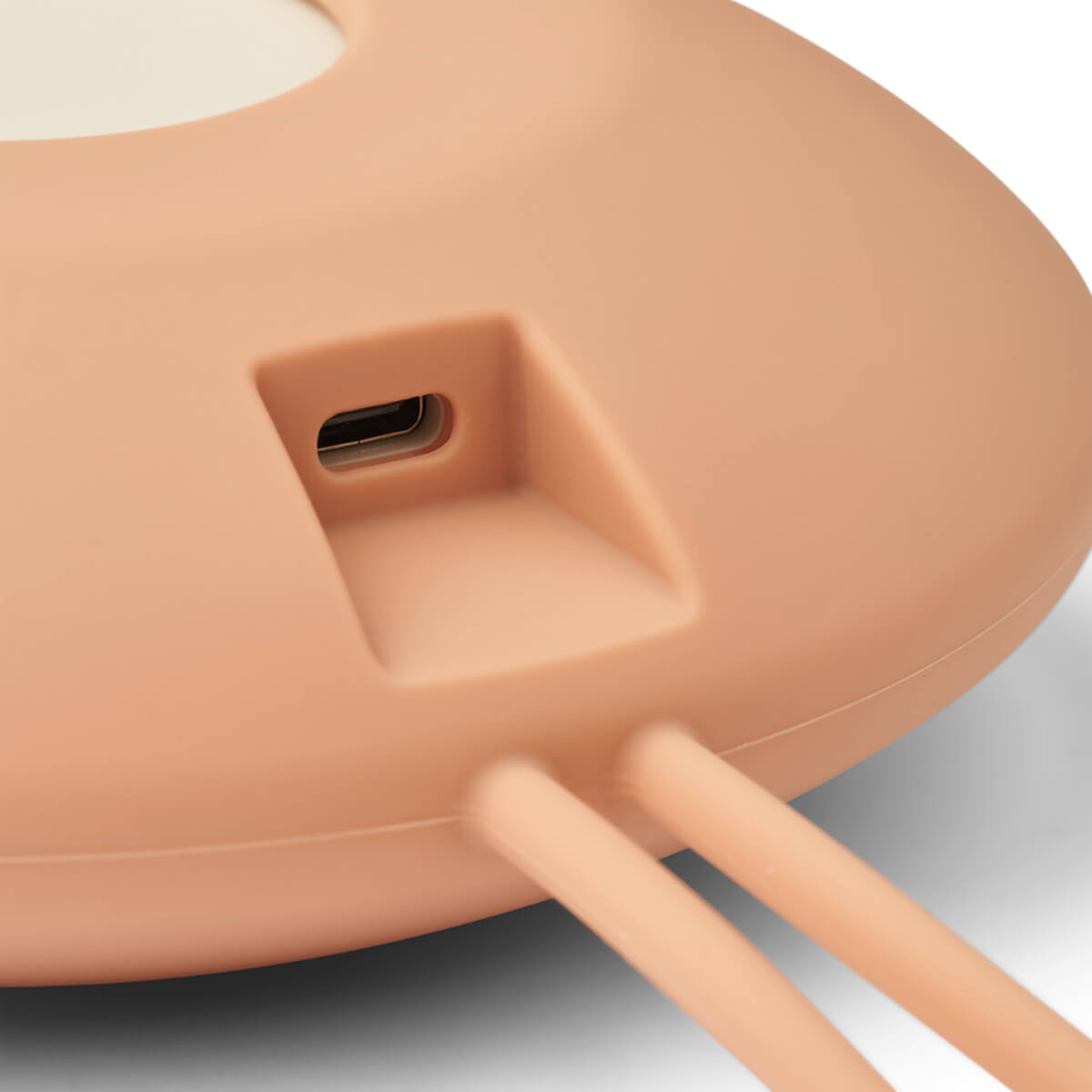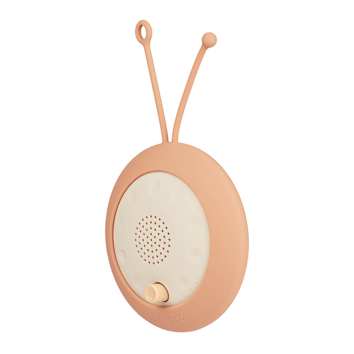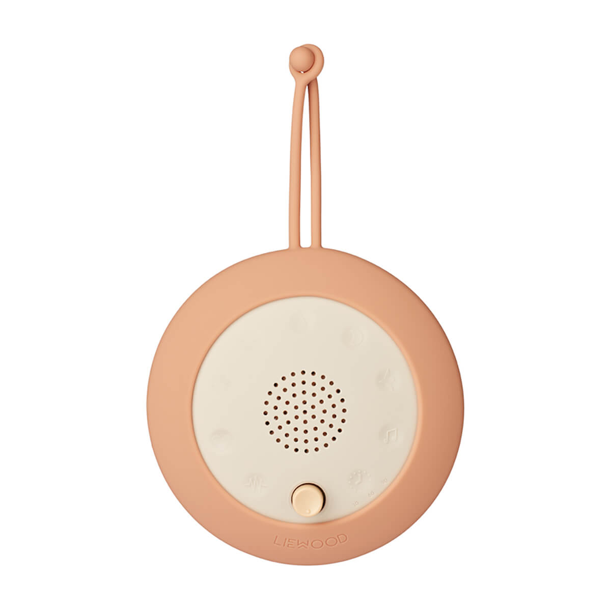 Jordi Sound Machine by Liewood. Portable sound machine with soothing sounds like pink noise, bird songs and breaking waves. Lightweight and easy to transport, easy to attach anywhere with the silicone strap. Standard USB-C charger included.