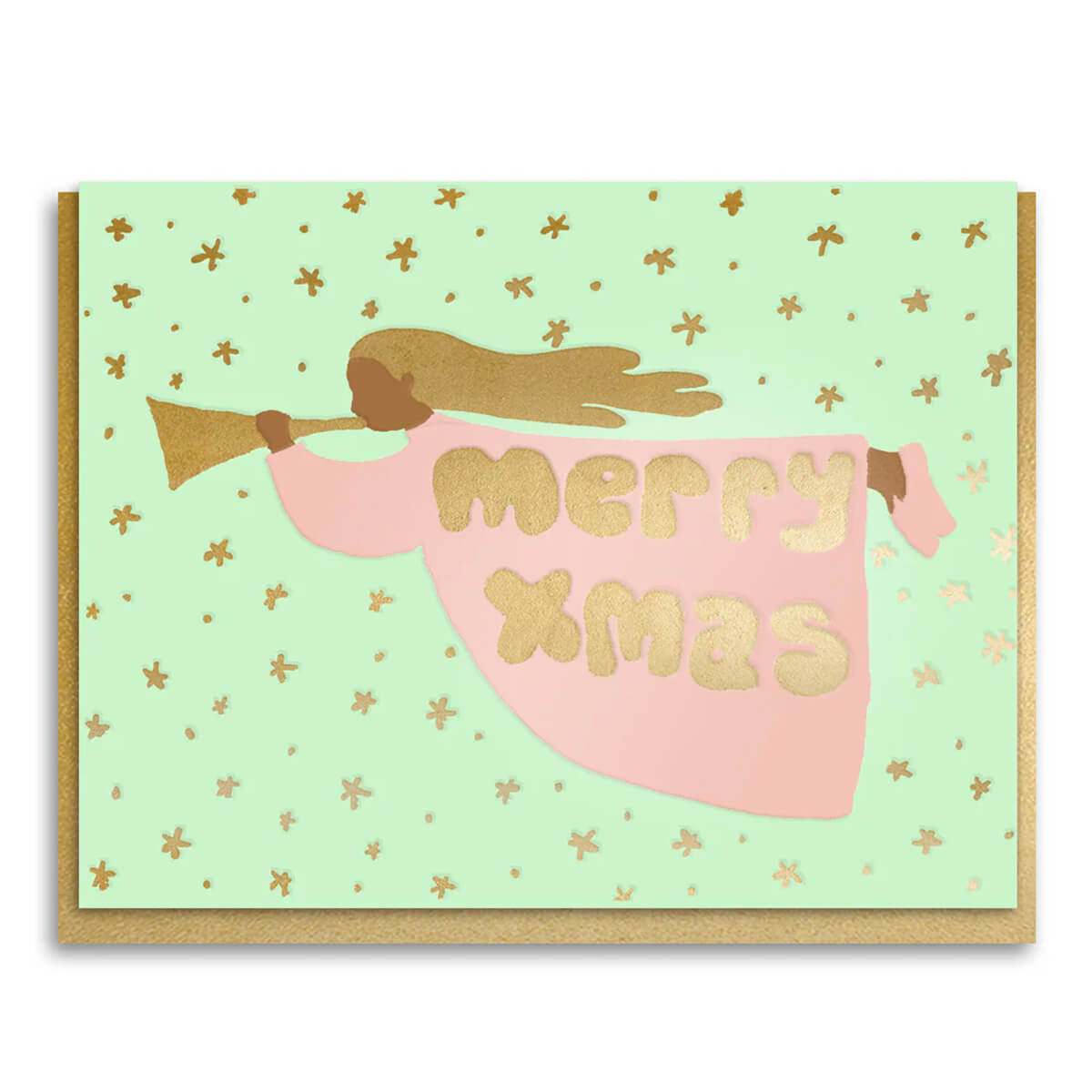 Joyful angel horn Christmas greetings card by 1973. This letterpress printed card with gold foiling features an illustration by 1973.