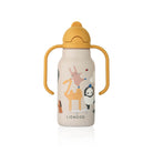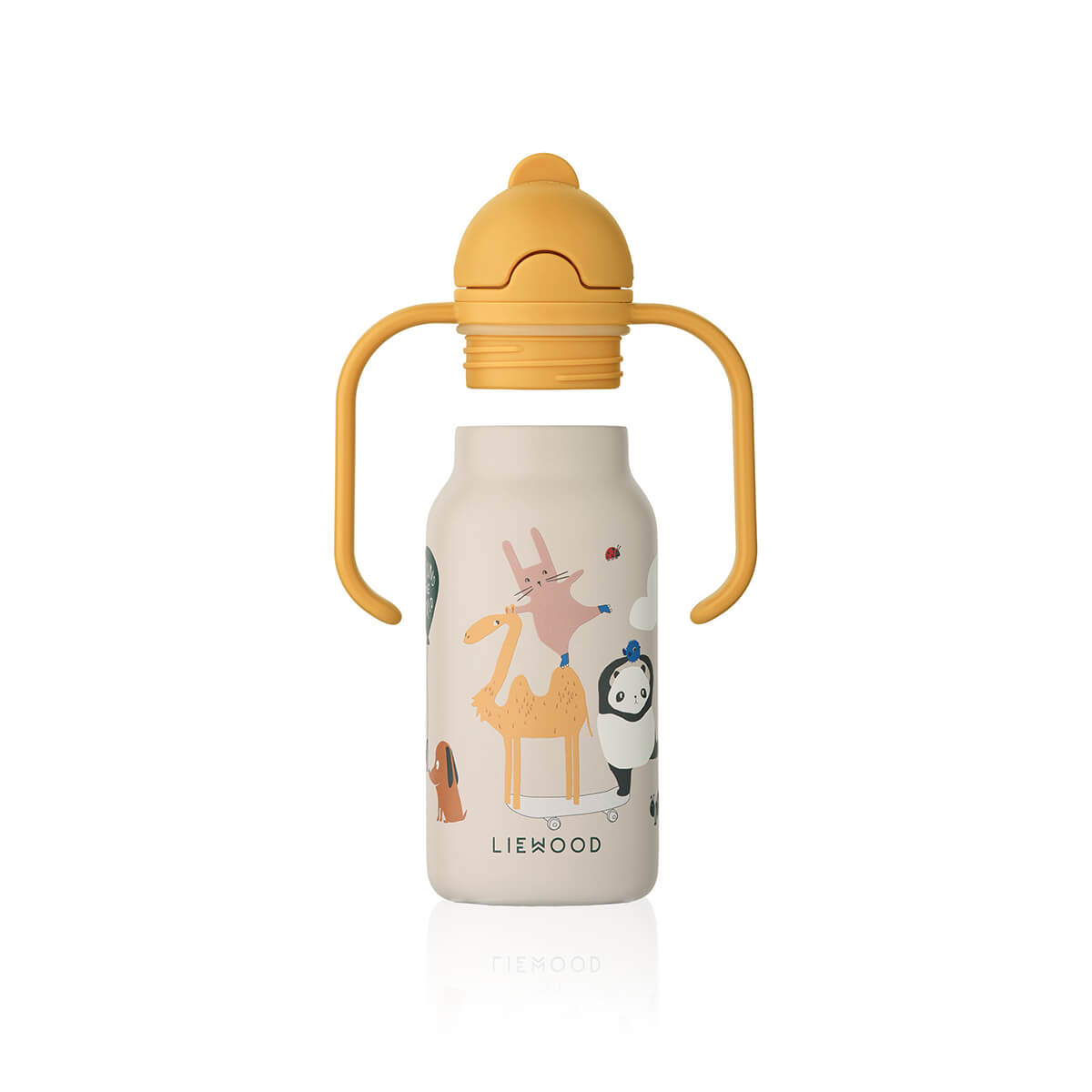 Kimmie water bottle by Liewood. Durable insulated toddler water bottle with rotating pop-up lid with built-in soft straw for spill-safe sipping. Keeps liquids cold for up to 12 hours or hot for up to 6 hours. Easy for litte hands to hold.