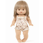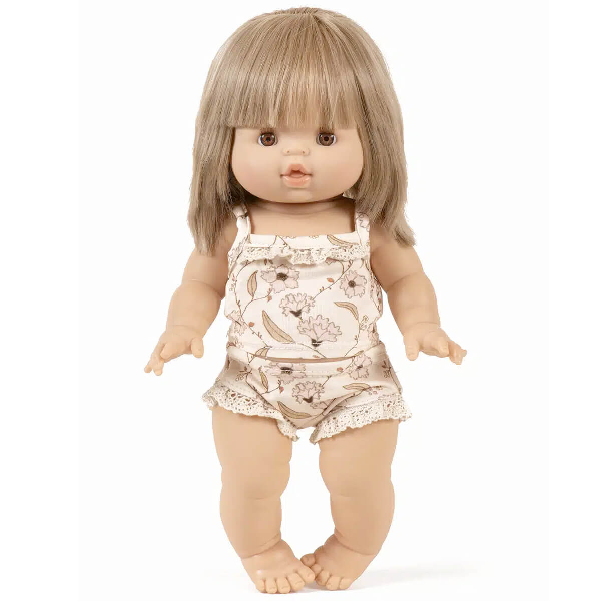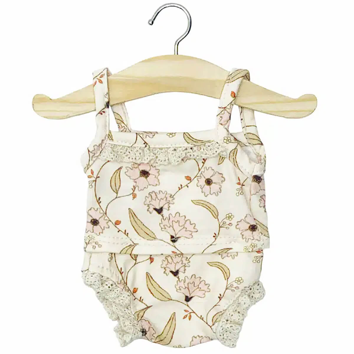 Lace trim Janelle Print girl's underwear set by Minikane. Beautiful handmade doll's camisole vest and pants set in a floral printed cotton material with lace details. Fits the Paola Reina 34cm Gordi baby dolls.