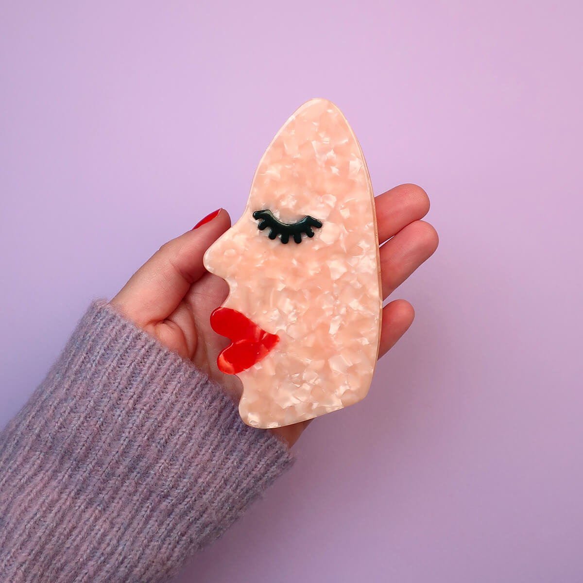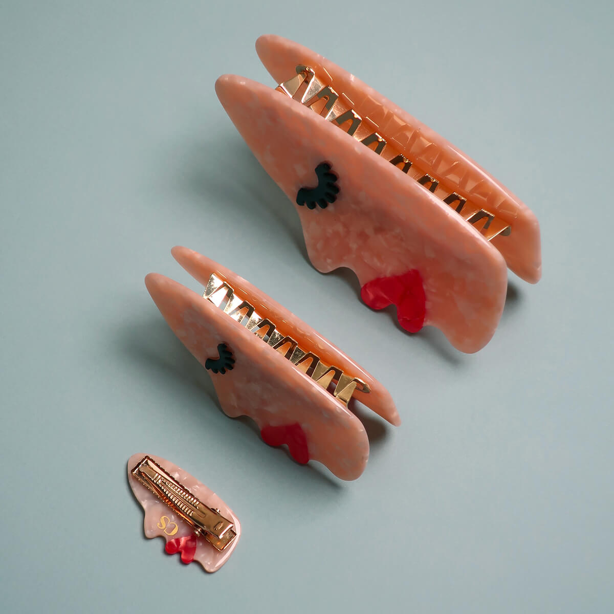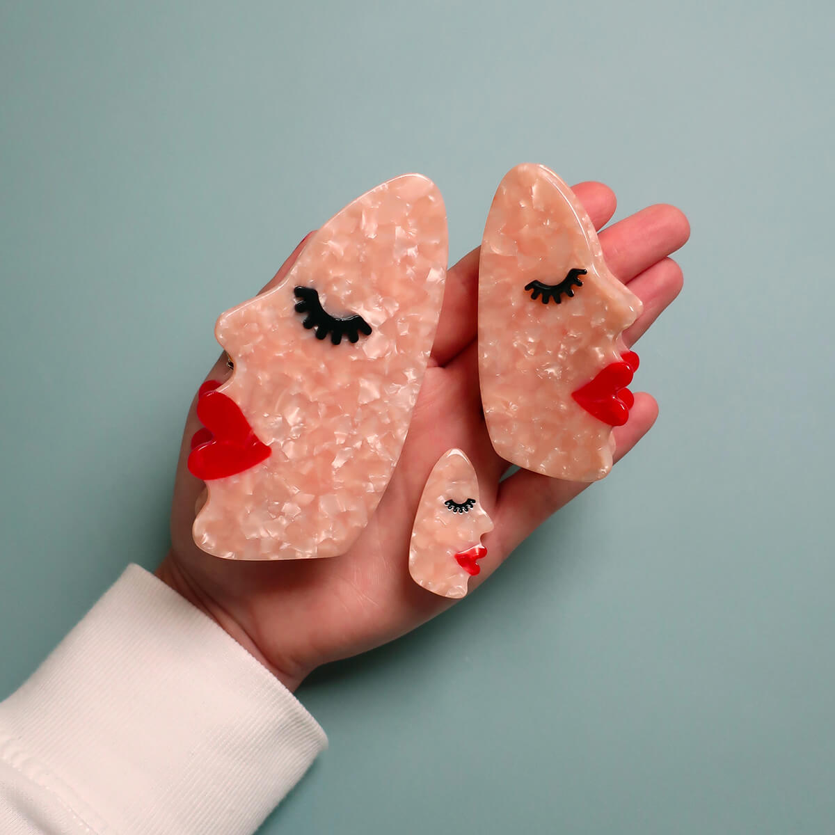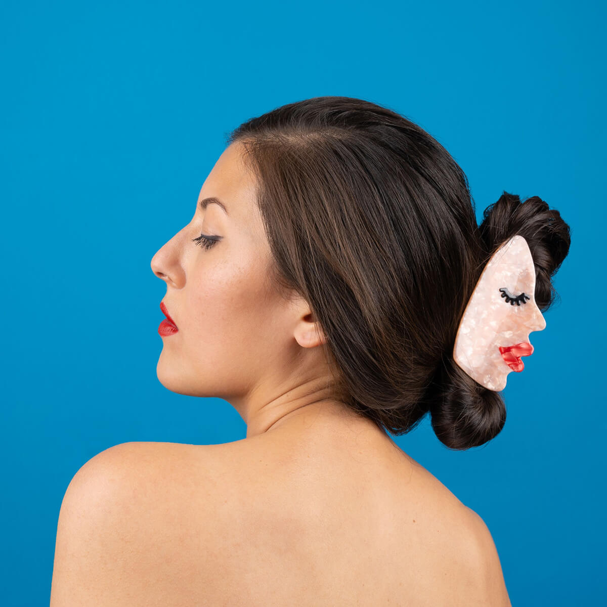Large Face hair claw by Coucou Suzette. The larger version of the Face hair clip, in pretty iridescent acetate. This XL hair accessory will tame the largest manes. In the shape of a pretty face with red lips, This hair claw is great for long, curly or thicker hair. Made from plant-based eco-friendly cellulose acetate.