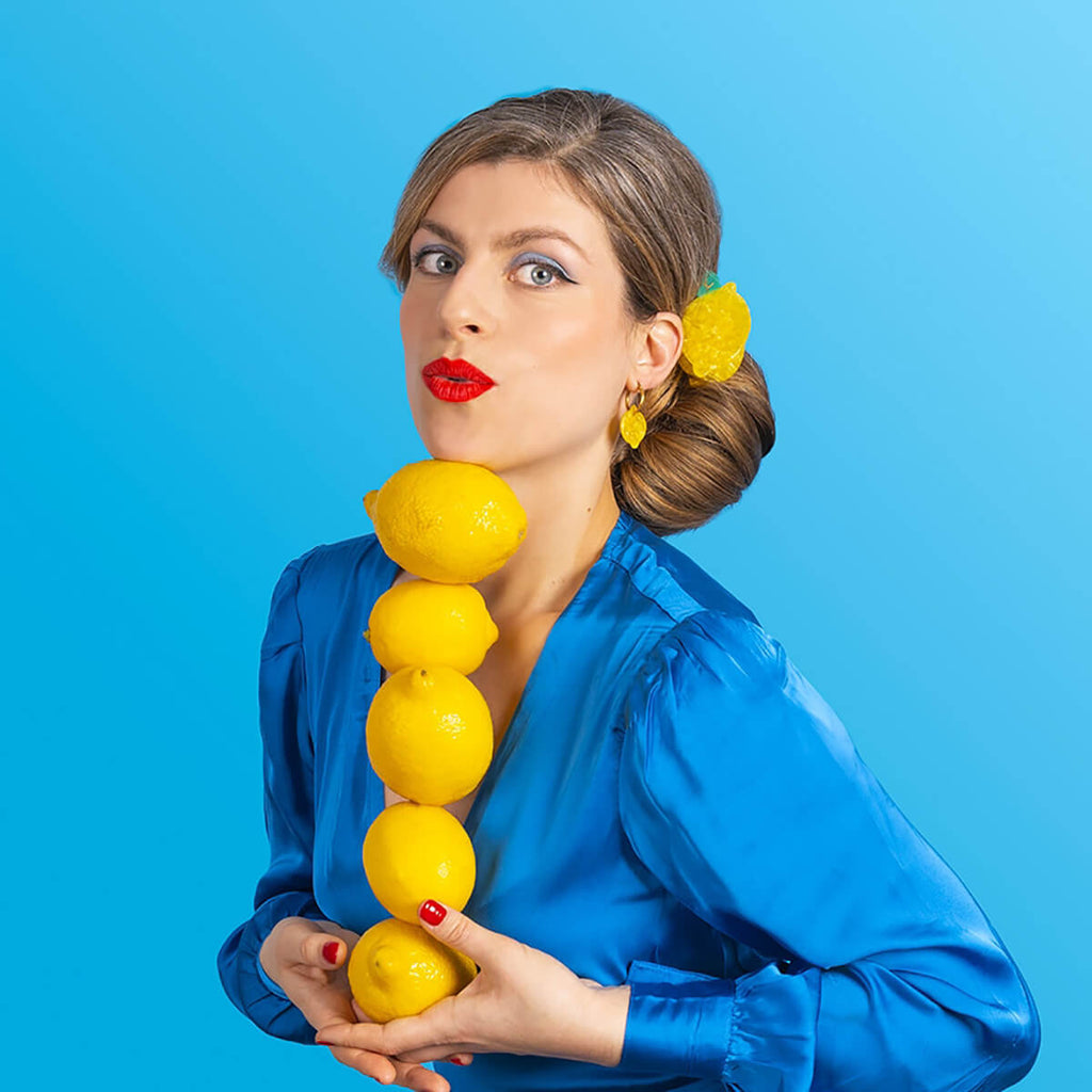 Lemon hair claw by Coucou Suzette. Full acetate hair claw shaped as a lemon. We love its small green leaf and its golden details which give even more pep to this already tangy citrus fruit. The perfect colourful accessory for hairstyles done in a hurry. Made from plant-based eco-friendly cellulose acetate.