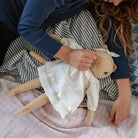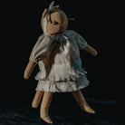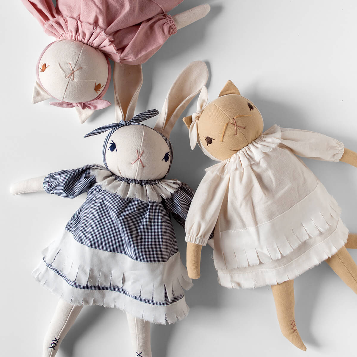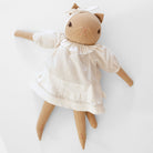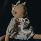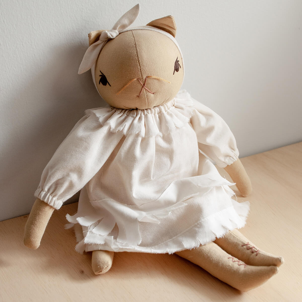 Mae large cat by Polka Dot Club. Mae is made from 100% cotton canvas with a hand-embroidered face. She has a disc-jointed neck and floppy limbs. She is wearing a cream cotton dress and a cotton headband.