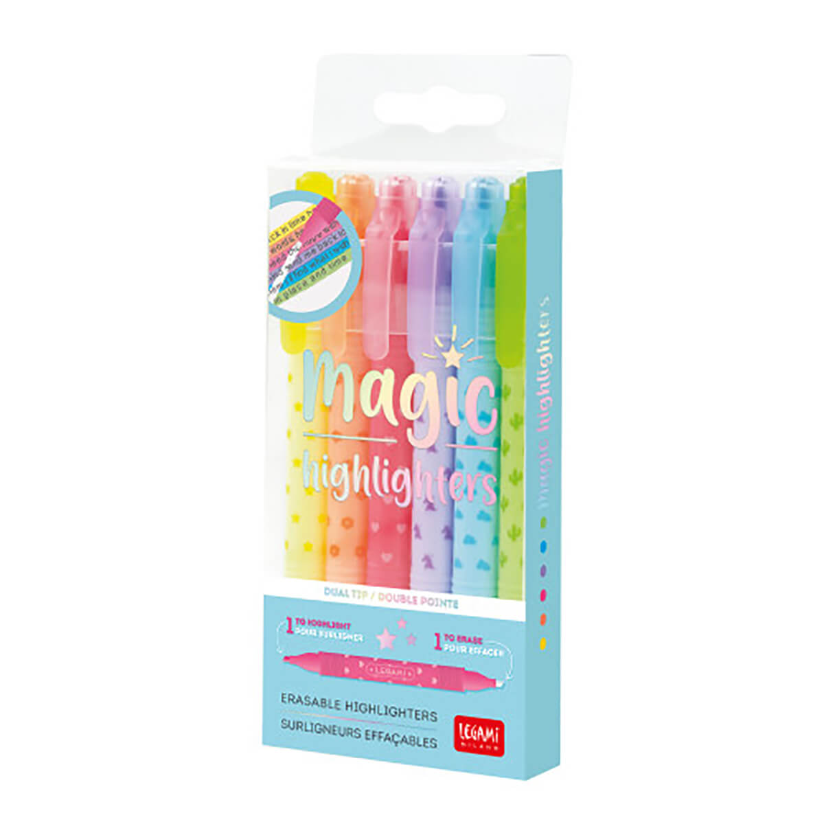 Magic erasable highlighters by Legami. Does that thing that seemed so important yesterday seem less important today? Well, sometimes priorities change. That is why you should always have the set of 6 erasable Magic Highlighters from Legami on hand. Each marker has two tips. You can use one tip to underline and highlight, and when you change your mind, just turn them over and use the second tip to erase.