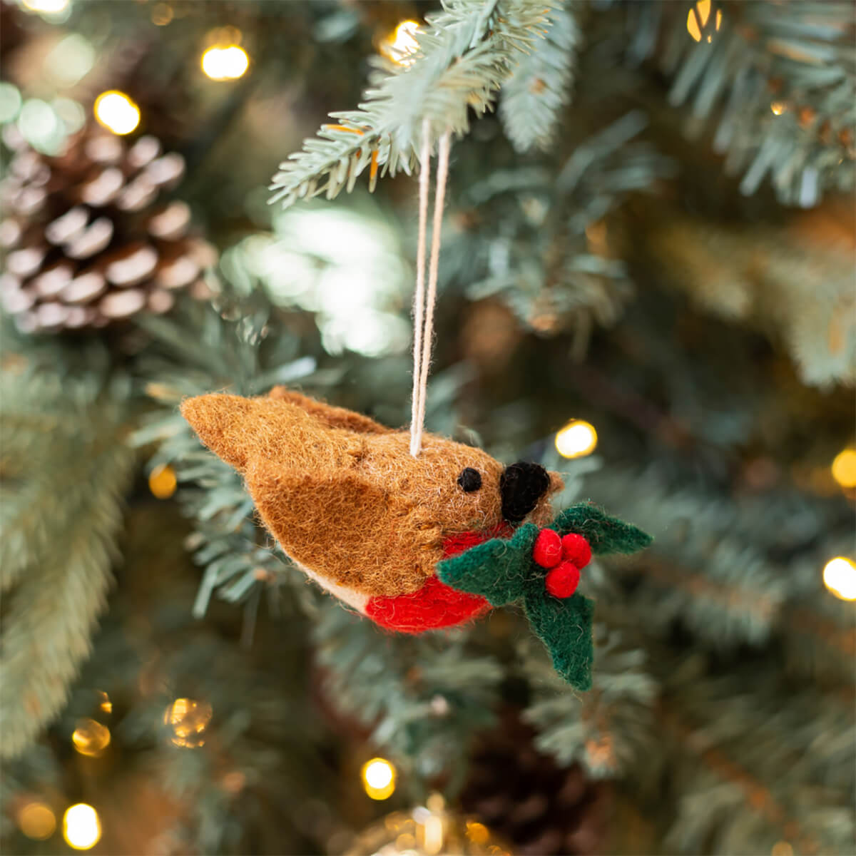 Mini robin with holly sprig hanging Christmas decoration by Amica. A beautiful, handmade and fair trade felt decoration.