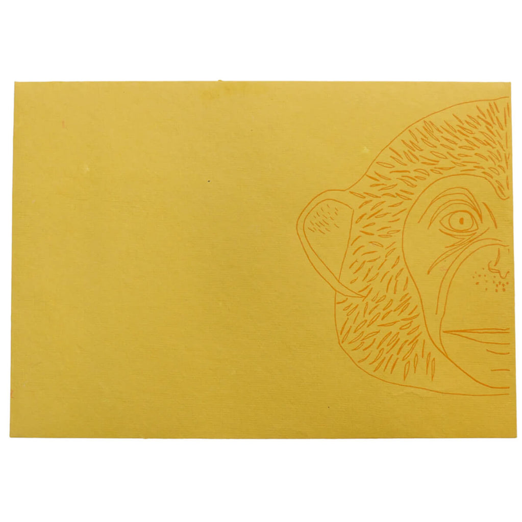 Monkey mask greetings card by East End Press. Hand printed greetings card printed and cut in the shape of a Monkey's face. The card is made from thick recycled paper with pre-cut eye holes, and ribbon either side so the greeting card can be used as a mask. Printed on the front with a blank reverse for the sender's message. The card comes complete with a hand printed coloured envelope with a monkey motif, to create a truly luxurious and special card.