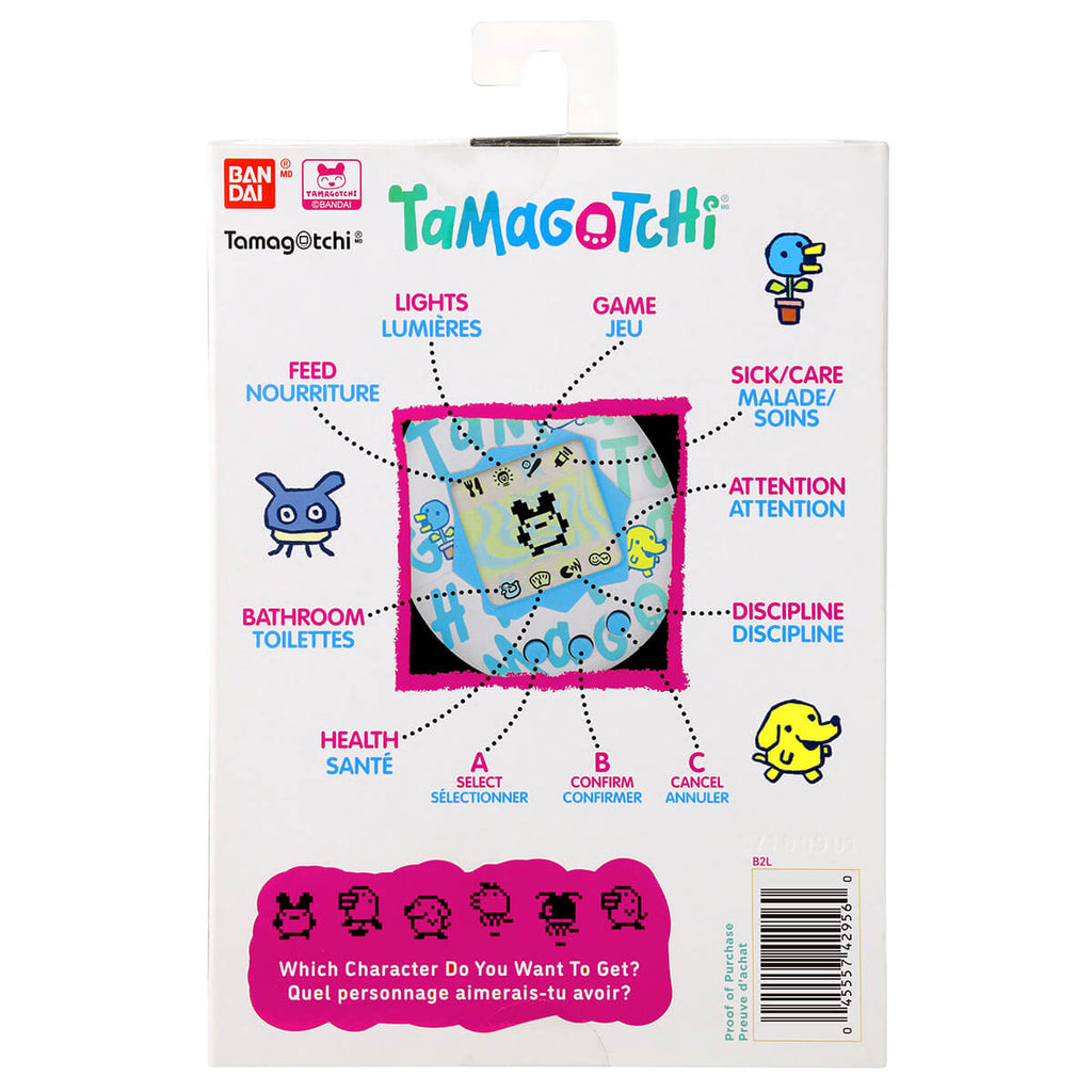 Original Tamagotchi by Bandai. The Original Tamagotchi pet is back! Feed it, turn lights on/off, play with it, give it medicine, flush after it's used the bathroom, check it's health and dicipline your tamagotchi if he bothers you when he's happy, fed, and all cleaned up.Raise your Tamagotchi from egg to child to adult. How you take care of it will decide which of the 7 adults you get!