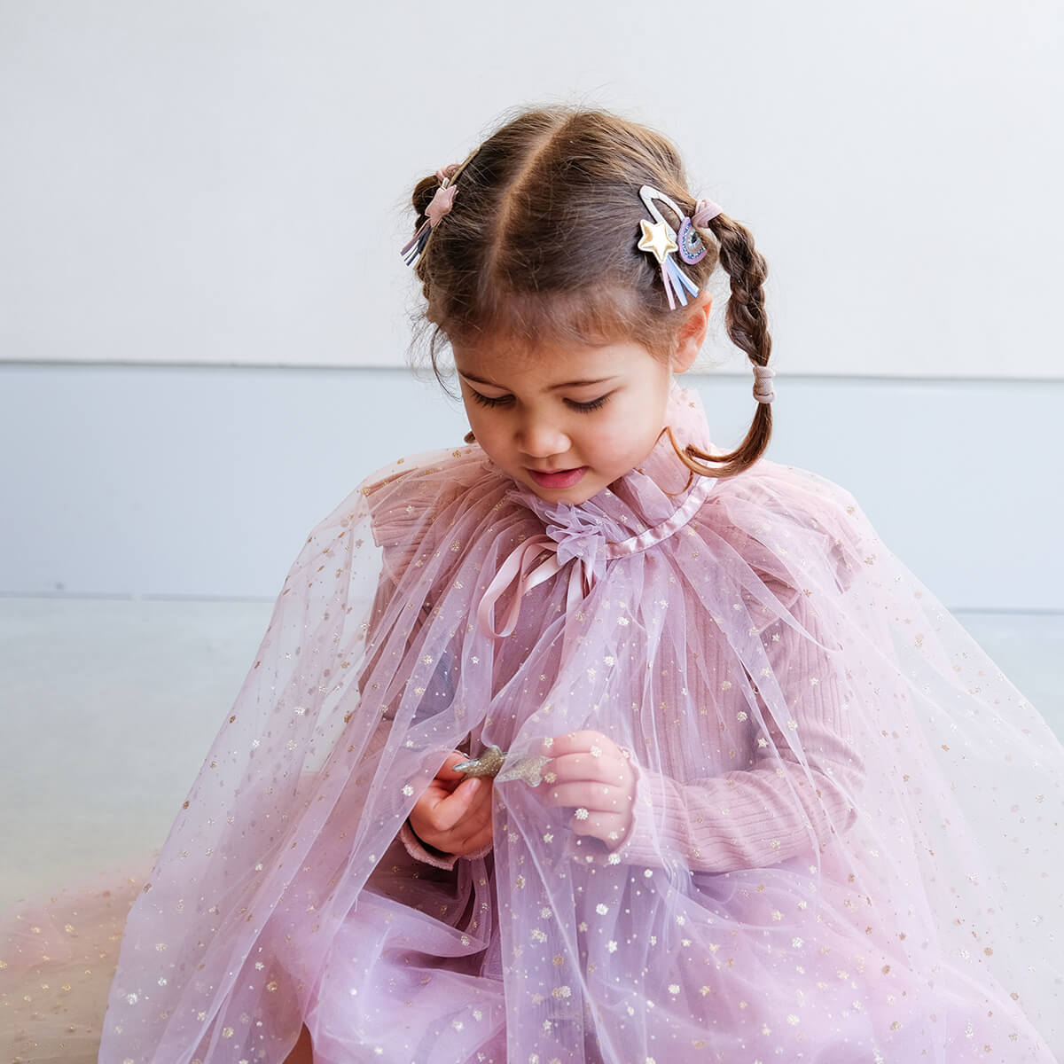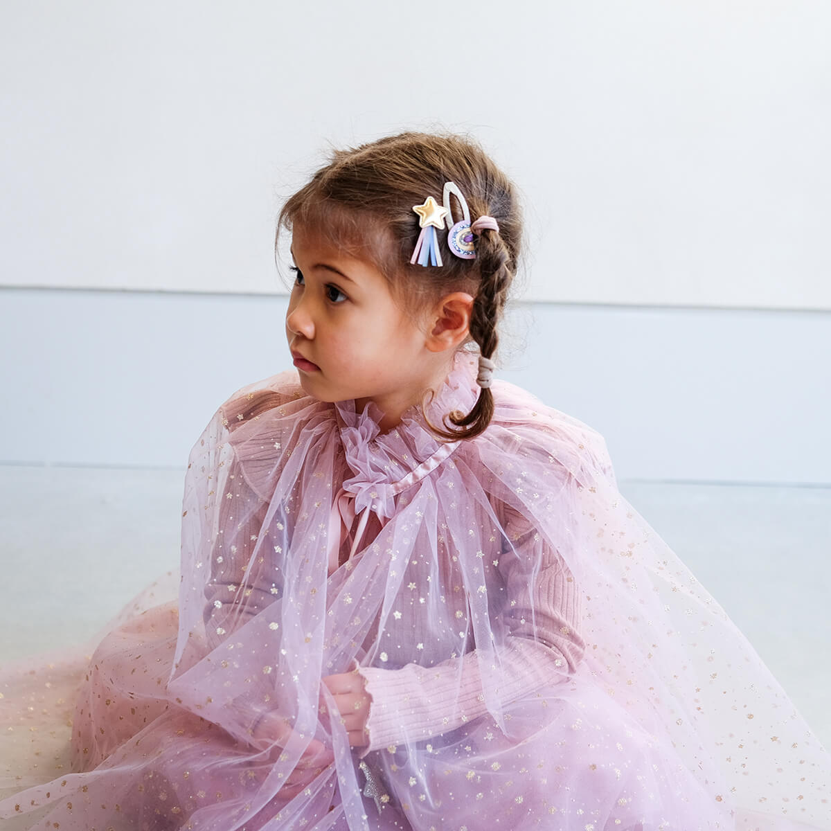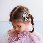 Over The Rainbow Clic Clac Hair Clips by Mimi & Lula. The most cheerful little pack of clips. Two super sweet and sparkly rainbows in the prettiest colours plus two shooting stars with colourful ribbon trails. Featuring rainbows in a combination of glitter and metallic fabrics and coordinating padded stars crafted in metallic and soft knit fabrics, both measuring approx 2.8cm.