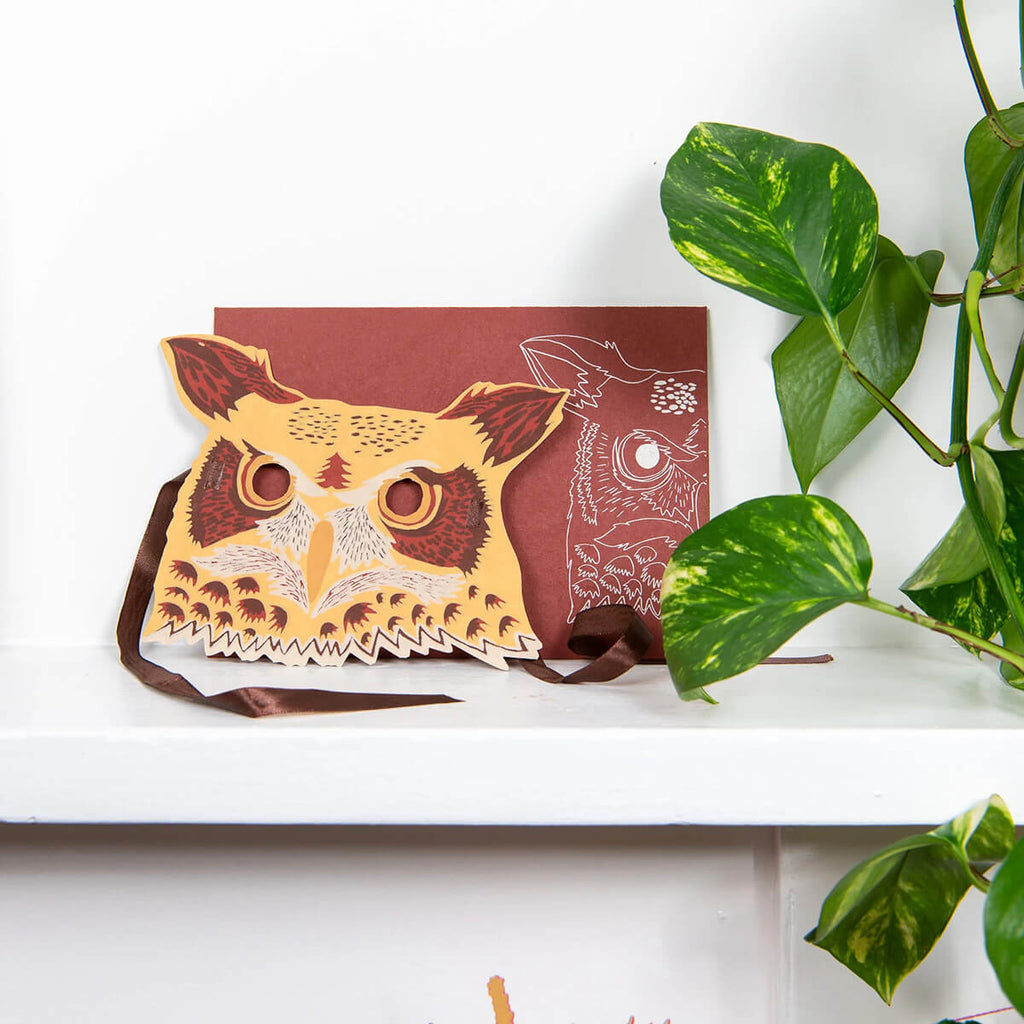 Owl mask greetings card by East End Press. Hand printed greetings card printed and cut in the shape of an Owl's face. The card is made from thick recycled paper with pre-cut eye holes, and ribbon either side so the greeting card can be used as a mask. Printed on the front with a blank reverse for the sender's message. The card comes complete with a hand printed coloured envelope with an owl motif, to create a truly luxurious and special card.