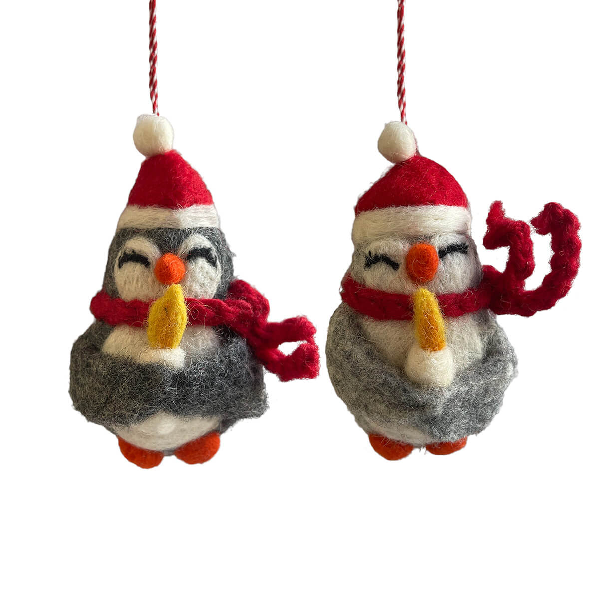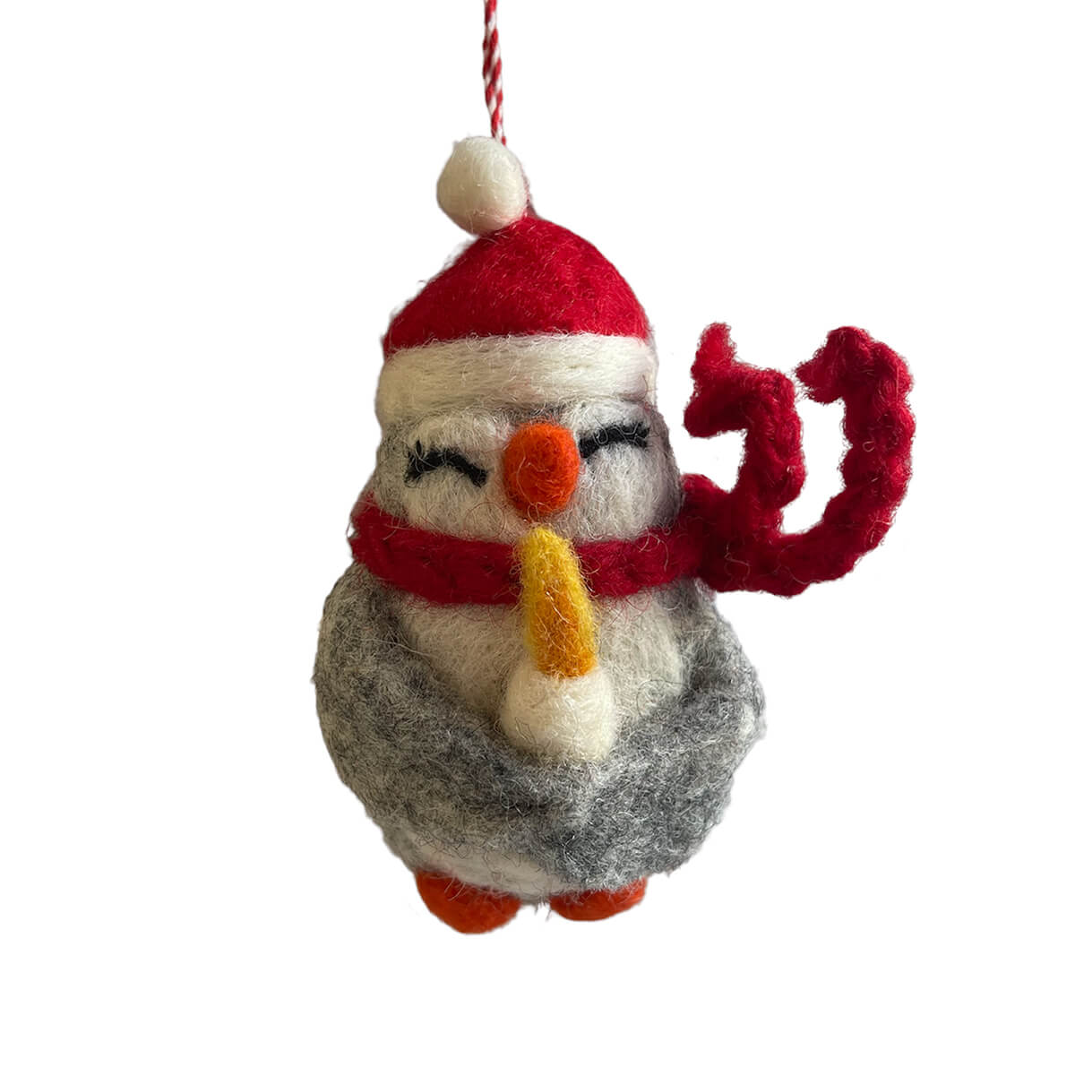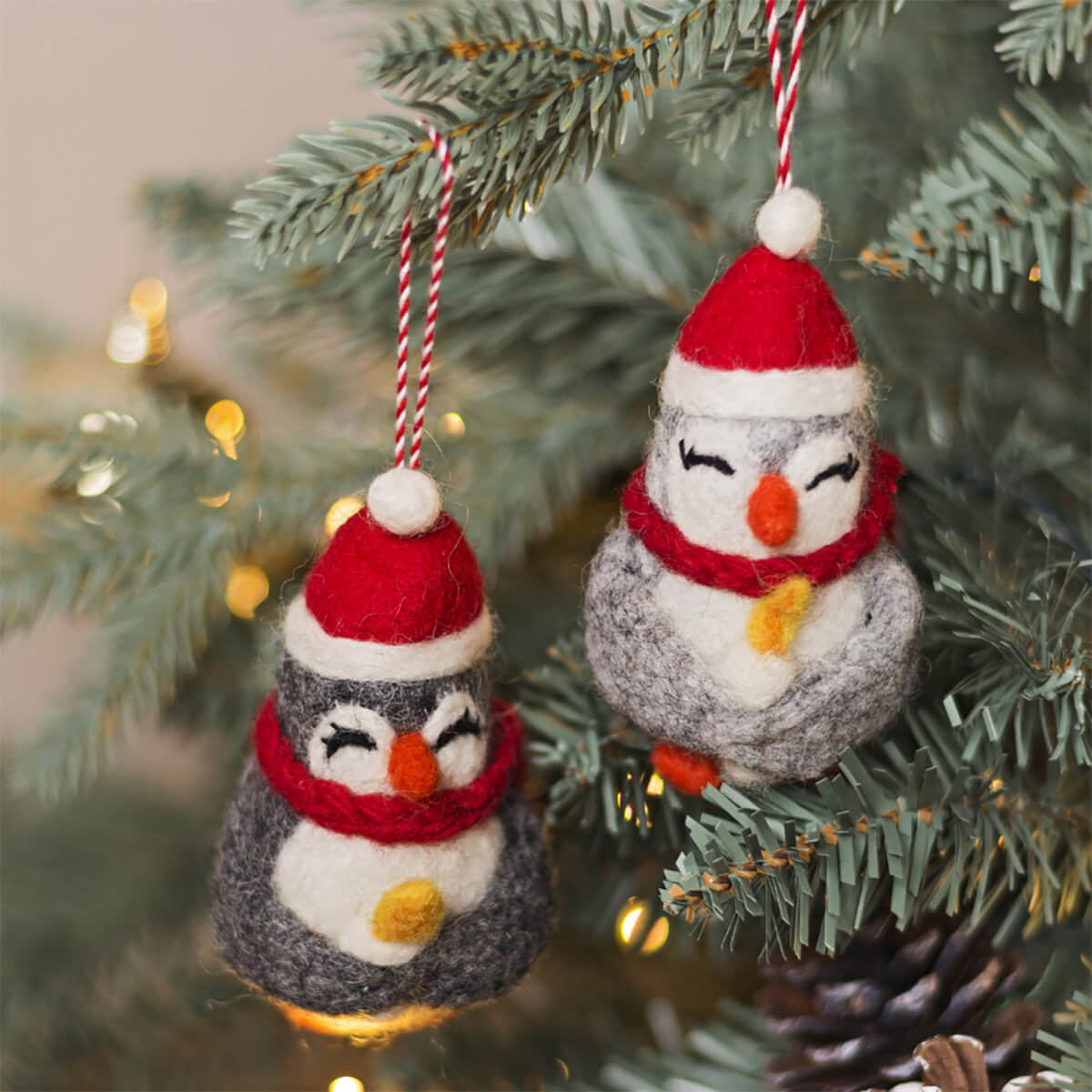 Penguin with candle hanging Christmas decoration by Amica. This super cute sleepy penguin is wearing a natty black bowler hat and red hand-knitted scarf and clutches a hand-felted candle. Handmade from 100% wool felt, Fair trade and plastic free from Nepal.