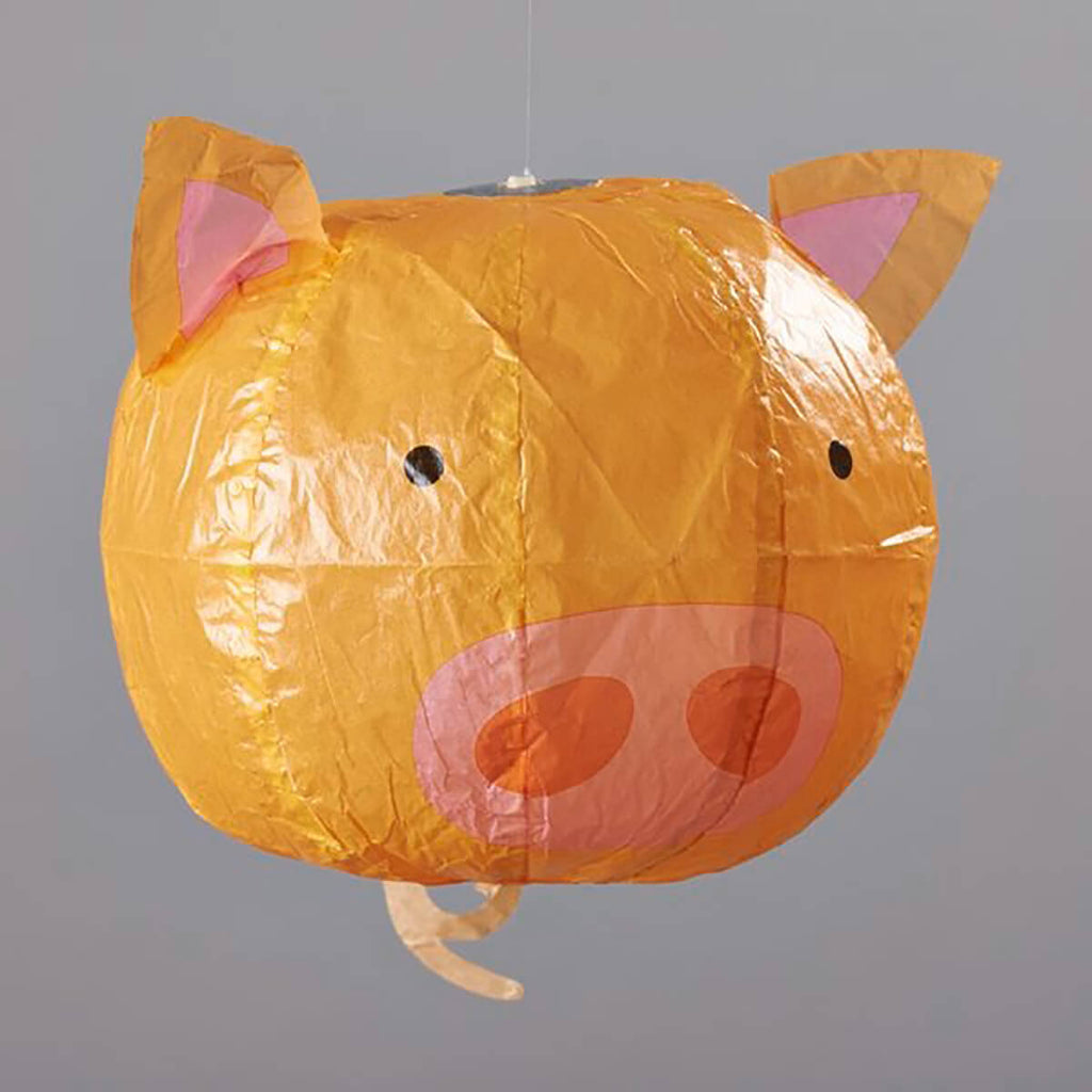 Pig Japanese paper balloon by Petra Boase.  Each balloon comes flat, to use simply blow in the hole which will force the balloon to expand, inflate and form into its circular shape character.  The balloons can be flattened and blown up over and over again.