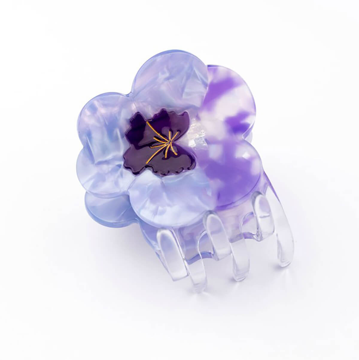 Purple Pansy hair claw by Coucou Suzette. A lovely full acetate single pansy hair claw in pearly purple with golden vintage details. Big enough to grab all your mane in a bun, whether you have thick, curly or long hair. Made from plant-based eco-friendly cellulose acetate.
