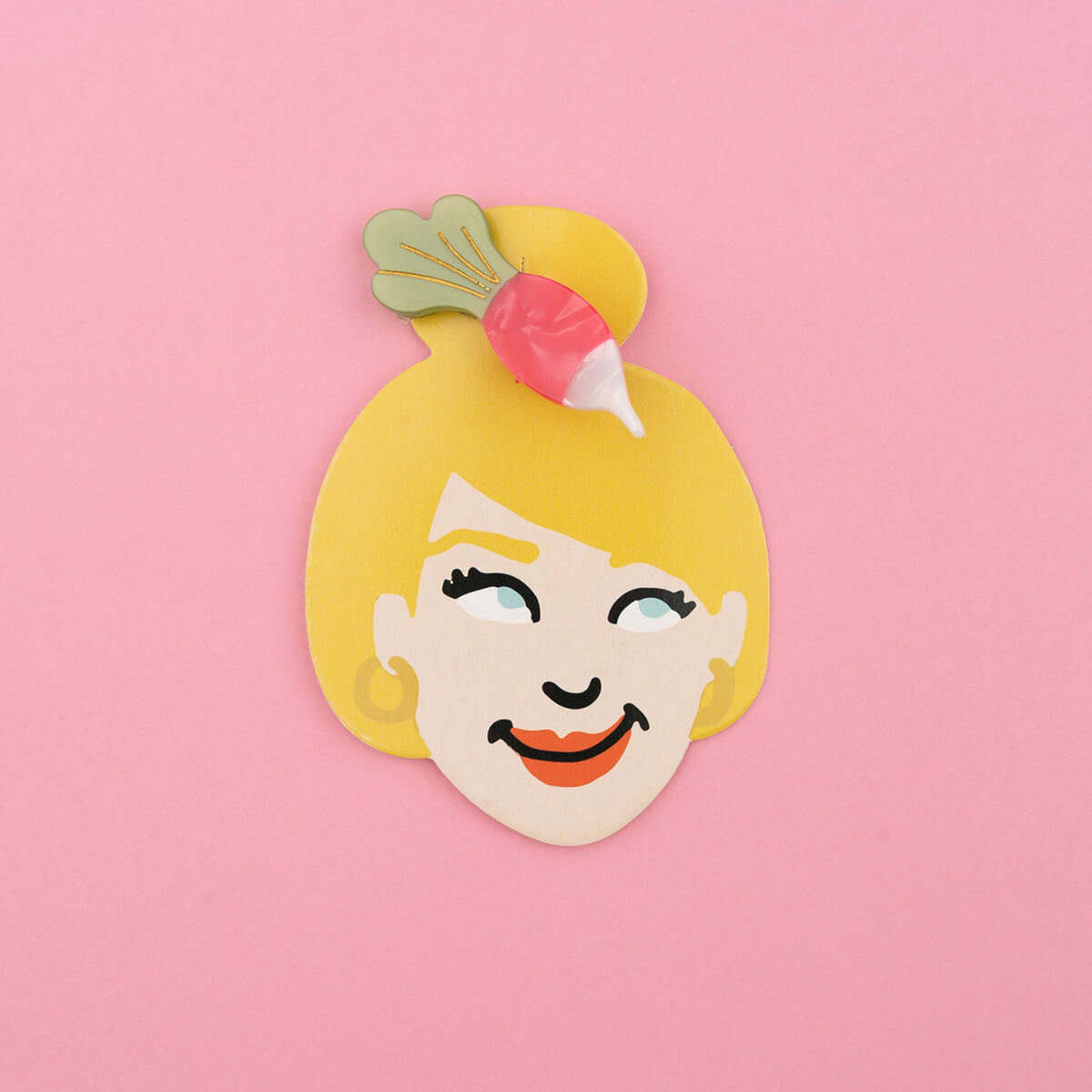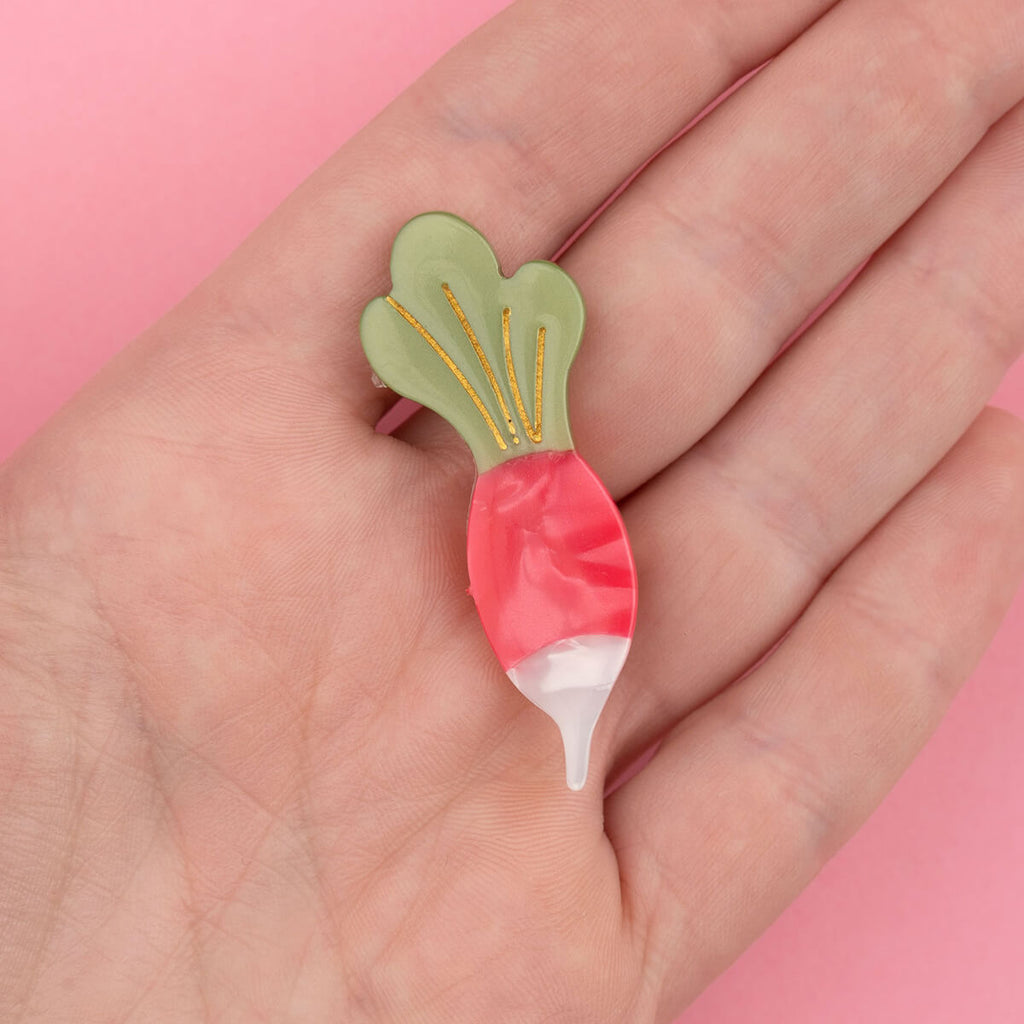 Radish hair clip by Coucou Suzette. A little pink and white radish, so cute with its green leaves covered in engraved gold ink details. The material is a nice iridescent cellulose acetate that gives endless shades and highlights to this little jewel accessory. Made from plant-based eco-friendly cellulose acetate set onto a gold-tone alligator clip.