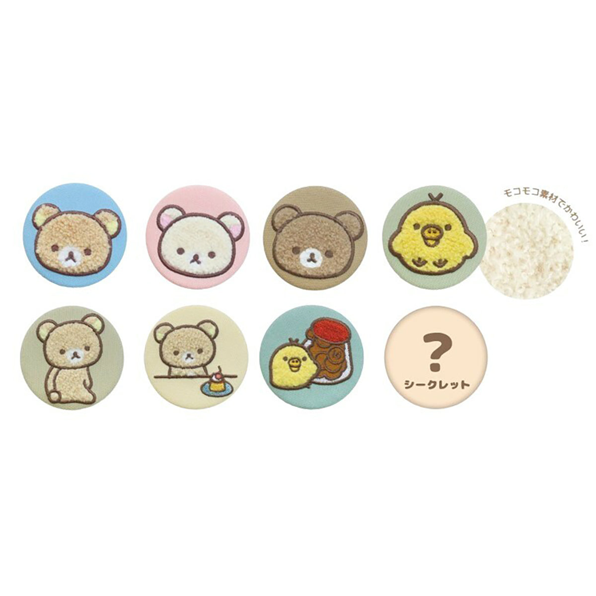 Rilakkuma Fluffy Mocomoco Boa Tin Badge blind bag by T's Factory Japan. Direct from Japan, this blind bag from T's Factory contains one of eight different Mocomoco fluffy badges featuring your favourite San-X Rilakkuma characters in fluffy boucle fabric with embroidered details.