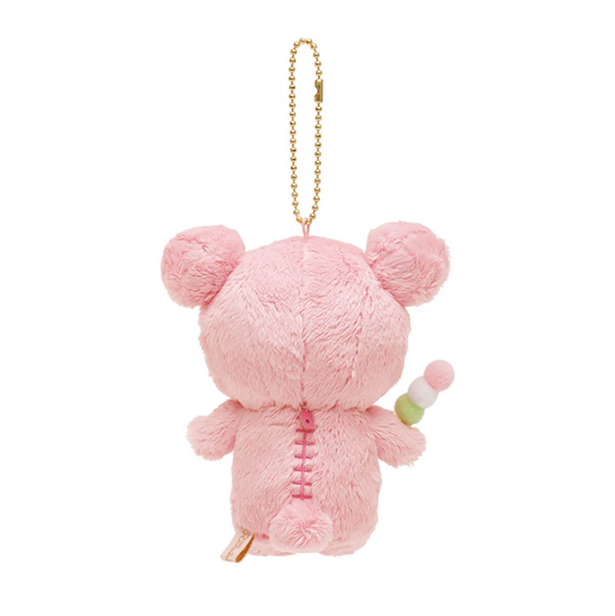 Rilakkuma Sakura Cherry Blossom Keychain (14cm) by San-X. Rilakkuma is a relaxed and cuddly bear (or is it, they wear a mysterious costume) who is impossible not to love. This special Japanese import Sakura Rilakkuma is super soft, with pretty floral patches on their feet and ears and a little cherry blossom on their left foot. They have Rilakkuma's signature zipper in pink on their back and a beany bottom so Rilakuuma can sit upright. Rilakkuma is holding a little pompom mochi stick, also knbown as Hanami Dango, a popular snack enjoyed during cherry blossom viewing in Japan. Includes a gold tone ball chain to hang Rilakuuma on your bag.