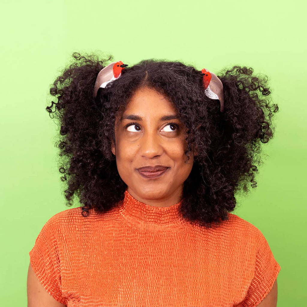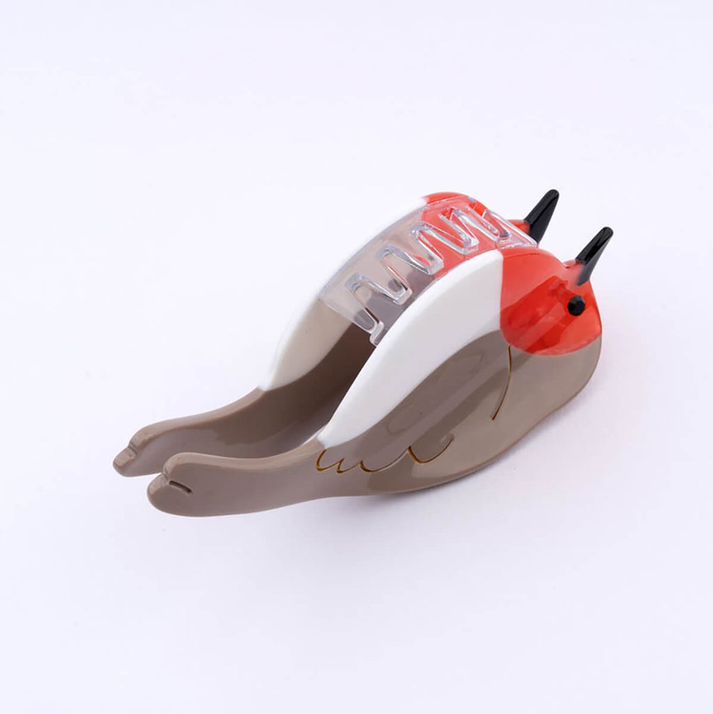 Robin hair claw by Coucou Suzette. Full acetate hair claw shaped as the sweetest robin red-breast. A beautiful accessory in white, brown and red tones, with a pretty glass rhinestone as an eye. Made from plant-based eco-friendly cellulose acetate.
