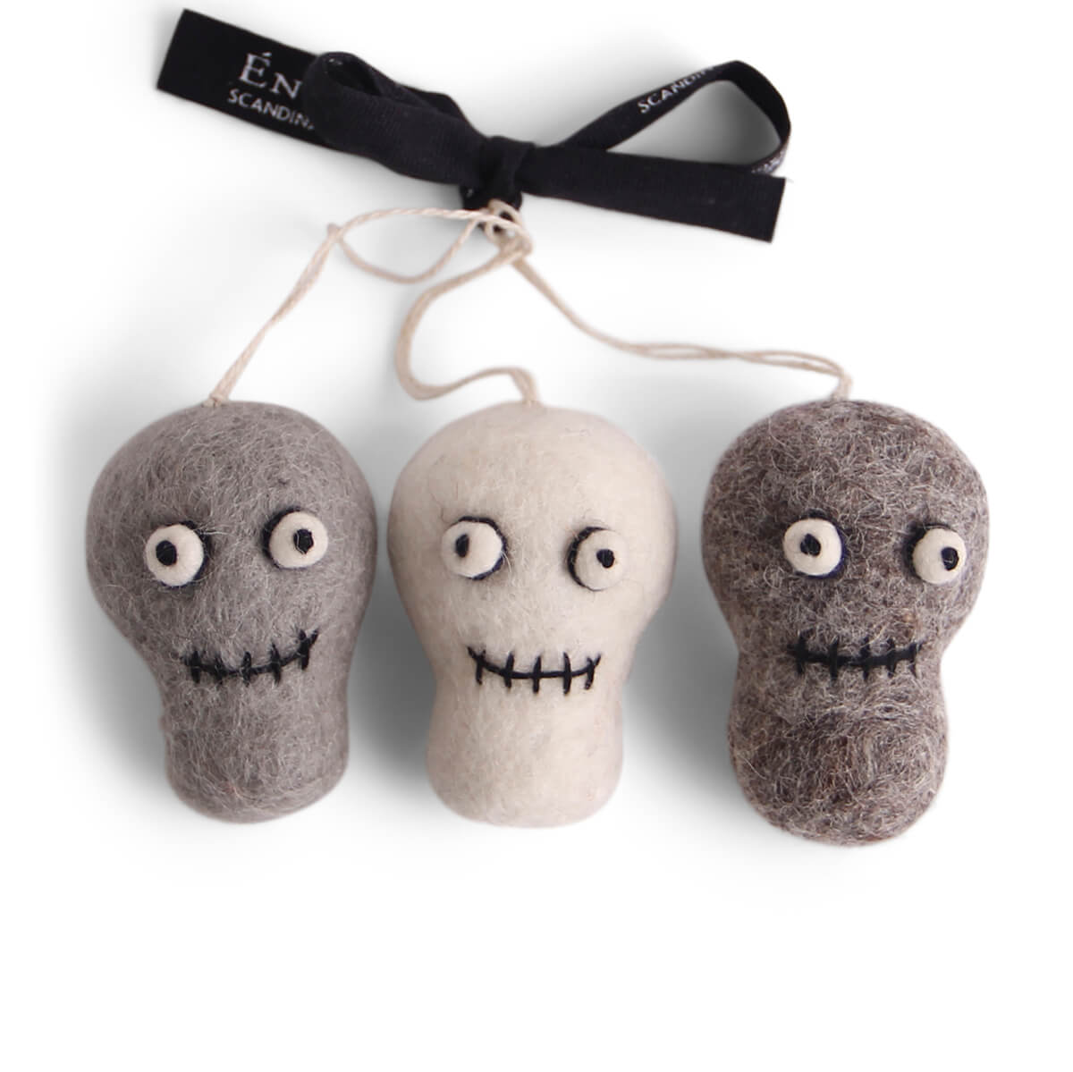 Set of three skeleton hanging Halloween decorations by Gry & Sif. Beautiful soft felted Halloween decorations with embroidered details in a Scandinavian style. Handmade and truly unique. Suitable for dangling from foraged branches in Autumn or as part of a spooky Halloween display.