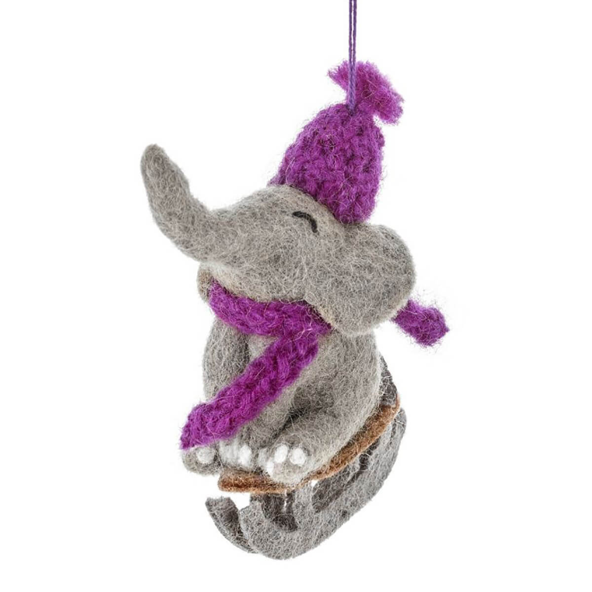 Sledging Elephant hanging Christmas decoration by Felt So Good. Ready to race you down the mountain this elephant looks like the epitome of snowy fun with his handknitted scarf and hat. Hand stitched and needle felted using traditional needle felting techniques by skilled Nepalese artisans.