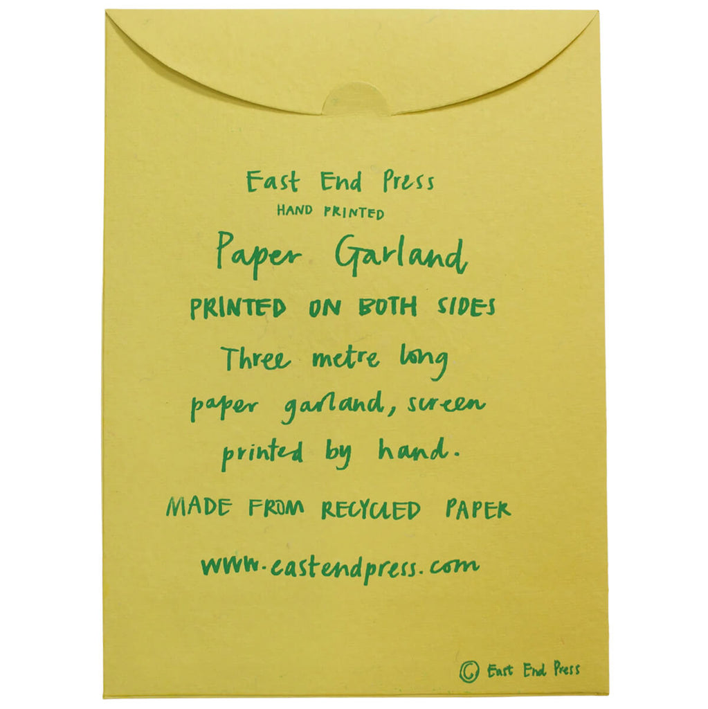 Garland made from recycled paper sewn along strong cotton thread. Packaged in a biodegradable cello sleeve backed with cardboard for safe storage when not in use.