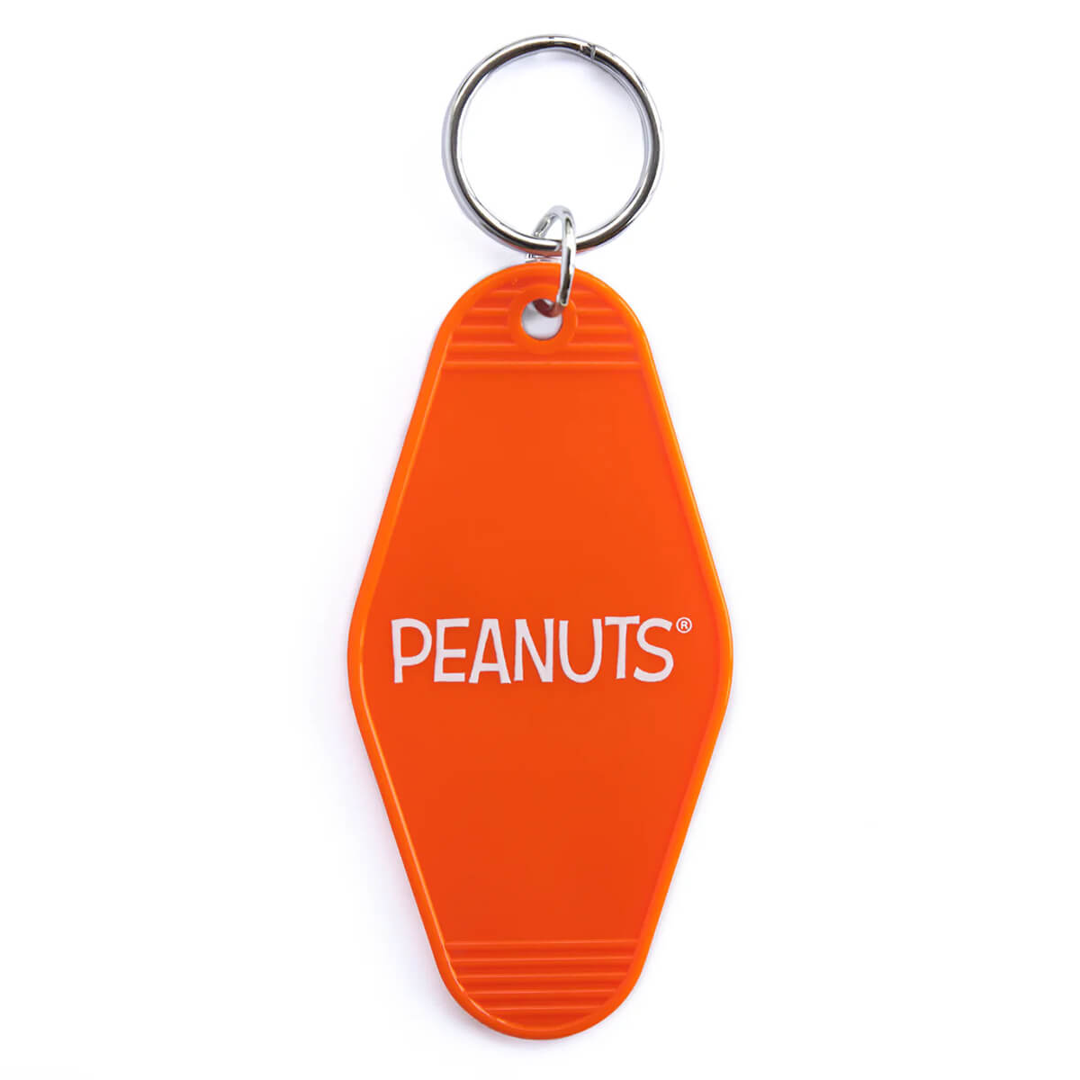 Snoopy Flower Bouquet Motel Key Tag by Three Potato Four X Peanuts. Adapted from classic hotel / motel key tags, these vintage-inspired keychains are adorned with a loving touch of Snoopy nostalgia. Printed on both sides - Peanuts logo on one side and Snoopy with a bouquet of flowers on the other - with a nickel keyring.