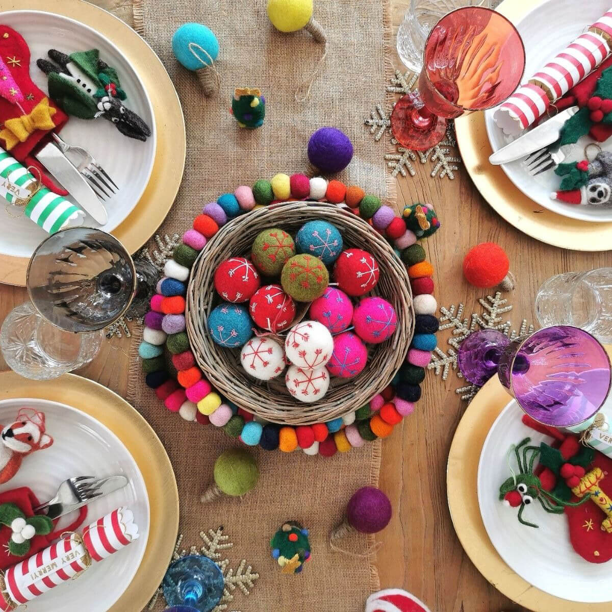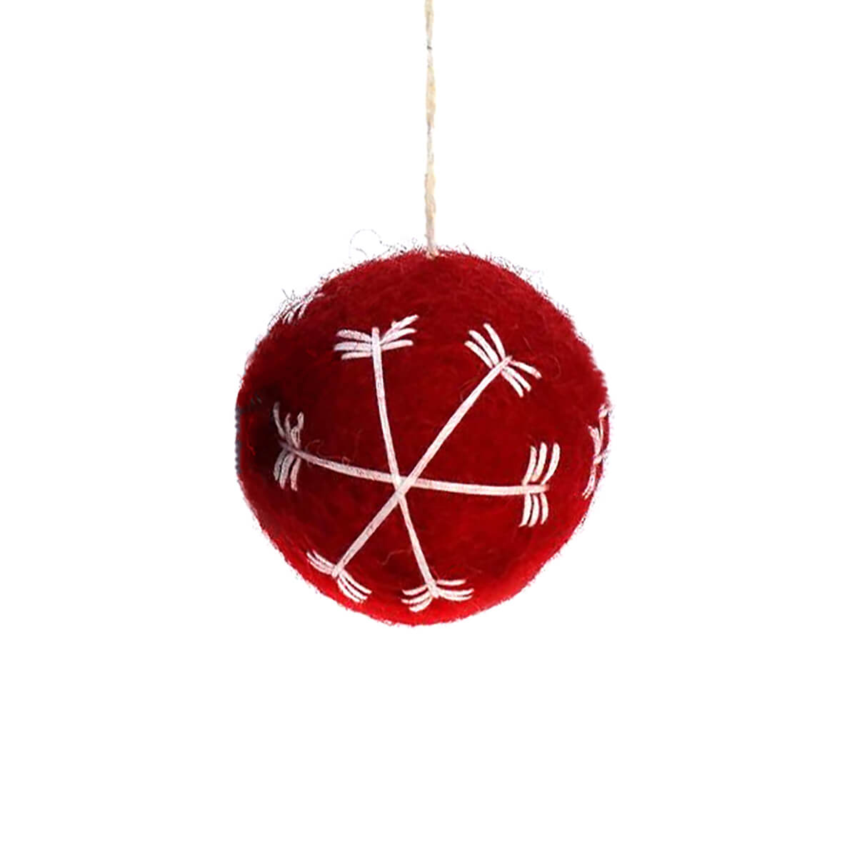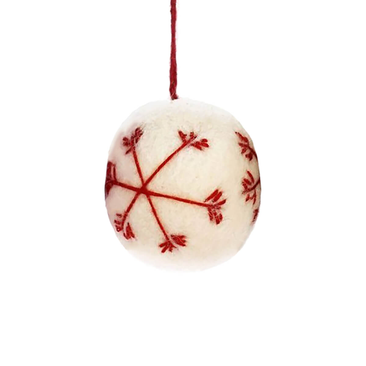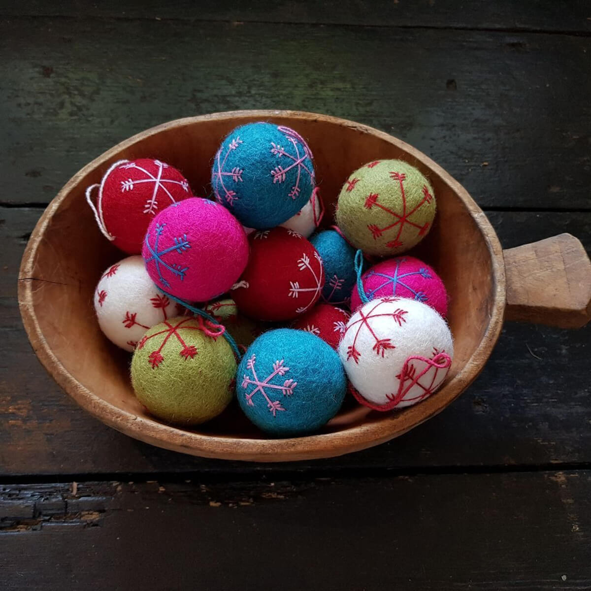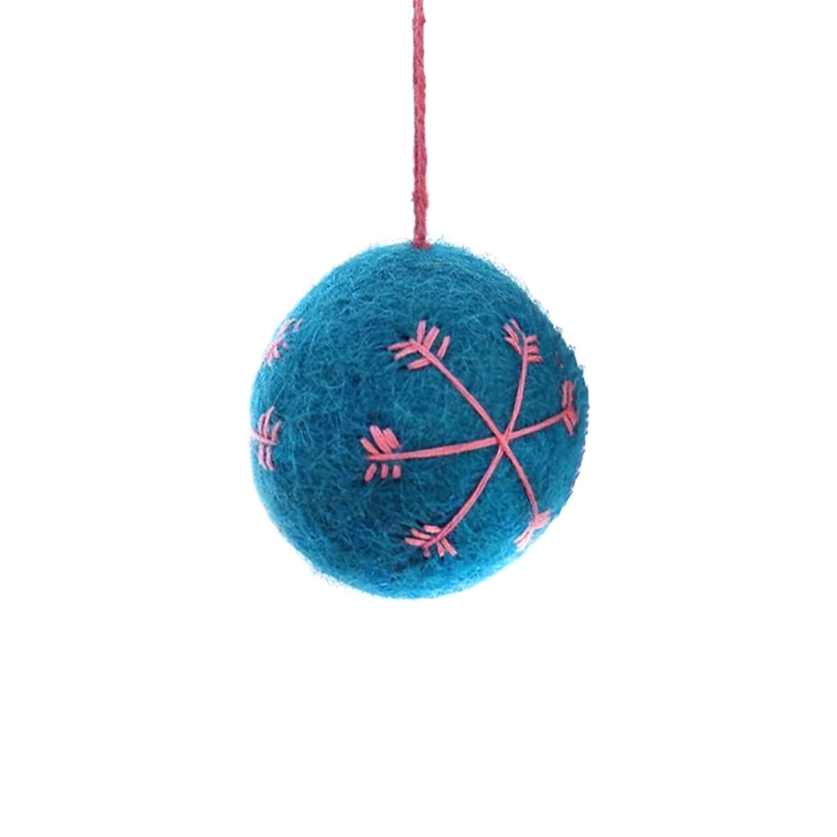 Snowflake baubles hanging Christmas decorations by Felt So Good. A set of five vibrantly coloured, felted baubles with hand stitched snowflake detailing. Perfect for adding a pop of colour and some felted flare to your Christmas tree! Each bauble is handcrafted using biodegradable and sustainable materials.