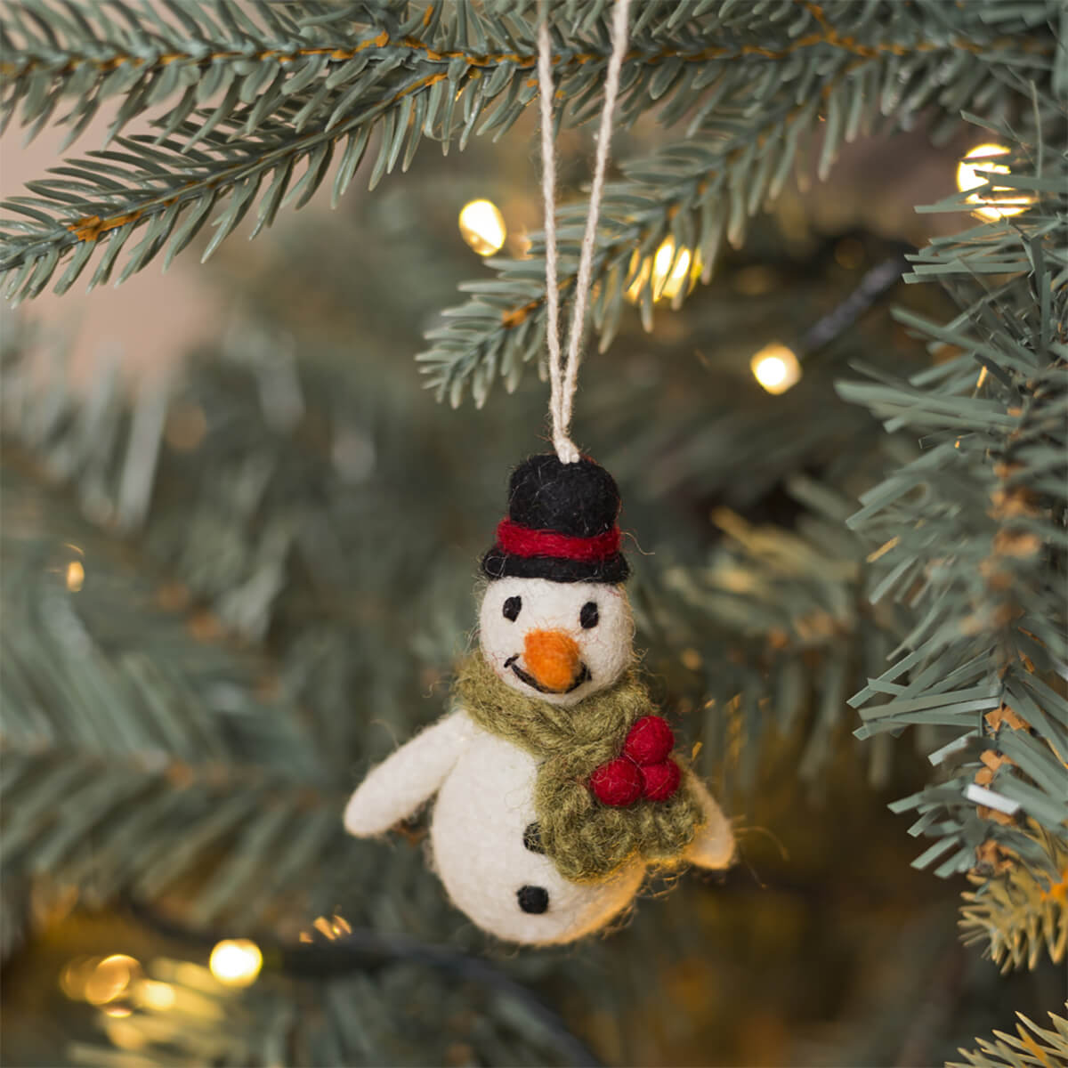 Snowman with holly scarf hanging tree decoration. A beautiful, handmade and fair trade felt decoration.