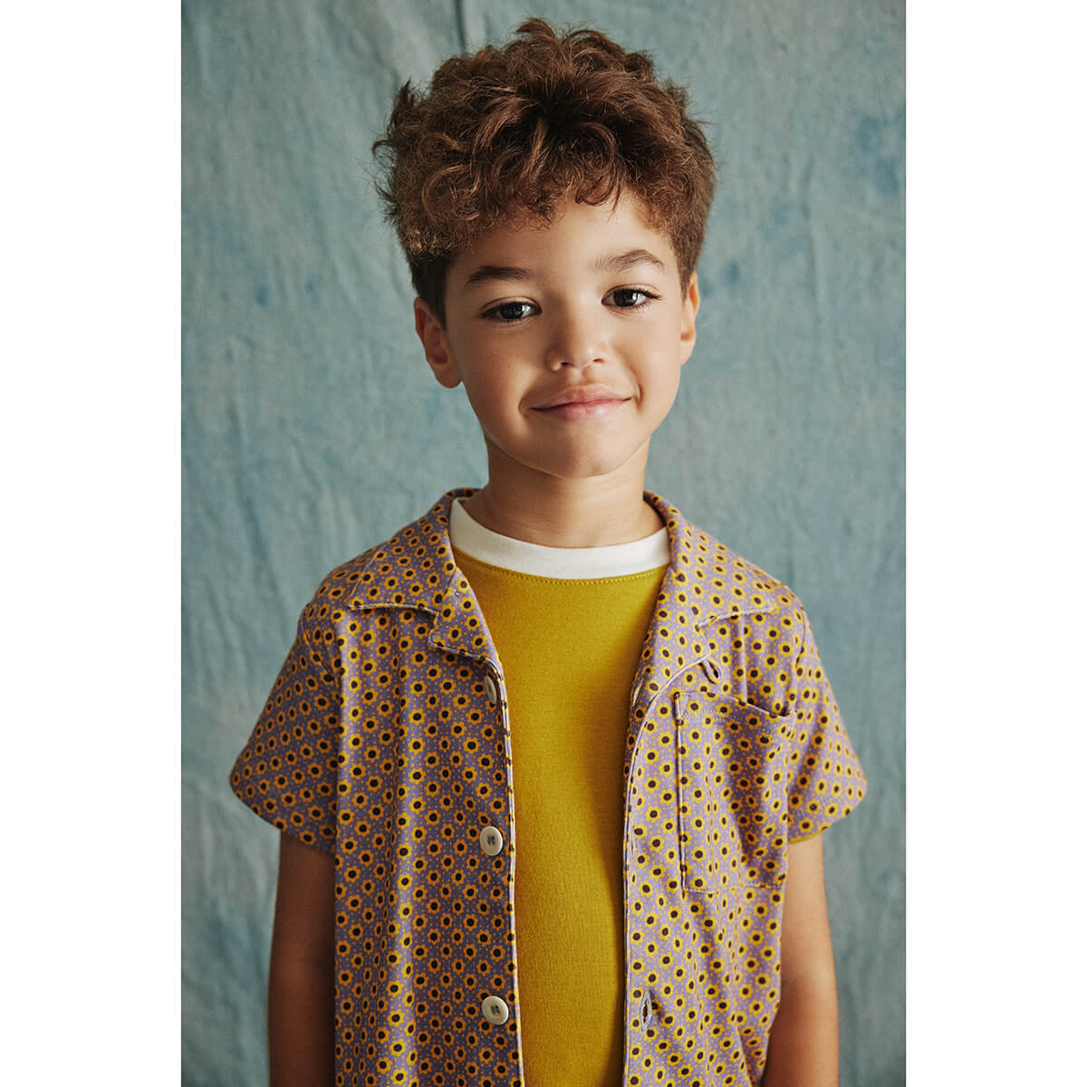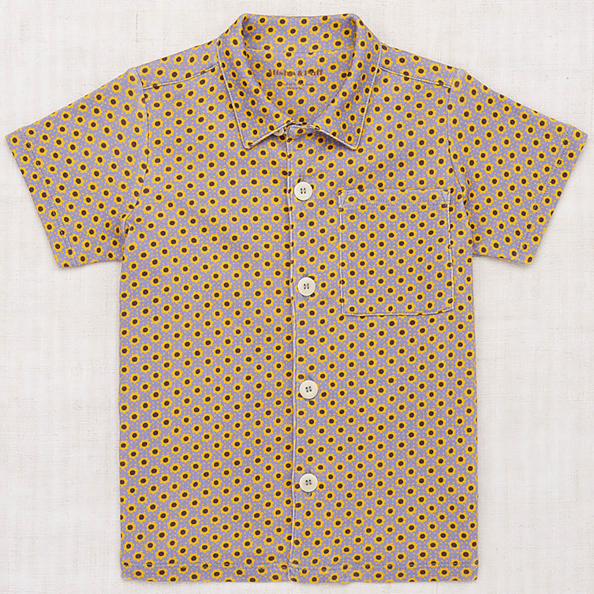 Sonny Top by Misha & Puff. A short sleeve button-up top in pima cotton, with a point collar, patch pocket, corozo button closure, and contrast topstitch detail. The perfect piece to grow with, plus a collar for layering. Featuring this season’s graphic print.
