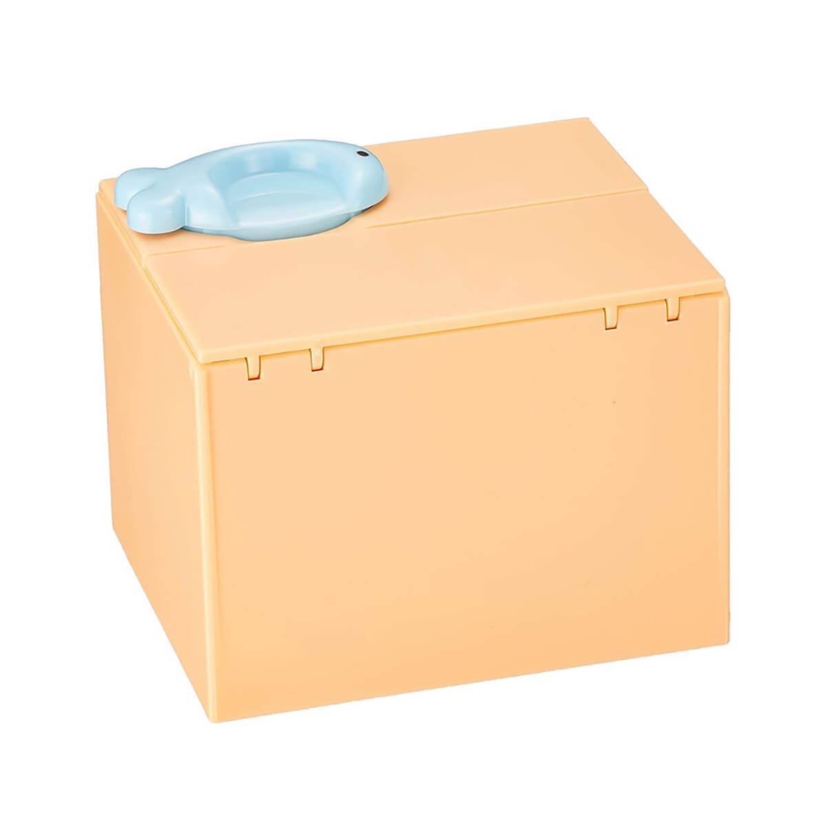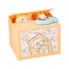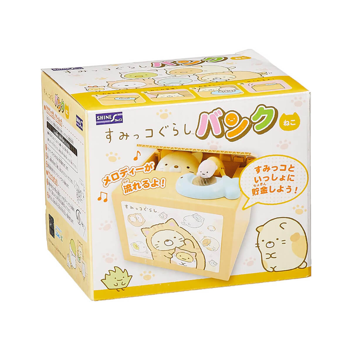 Sumikko Gurashi Neko and Tapioca Piggy Bank by San-X. Neko and Tapioca are waiting inside this box shaped money box to pop up and collect your coins while sweet music plays! Place a coin on the tray and watch Neko pop out while Tapioca takes the coin inside the box.