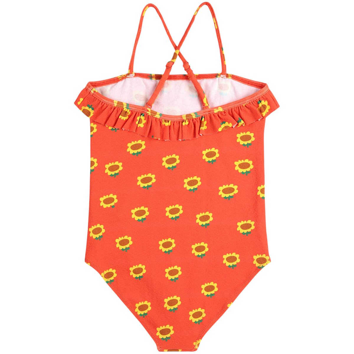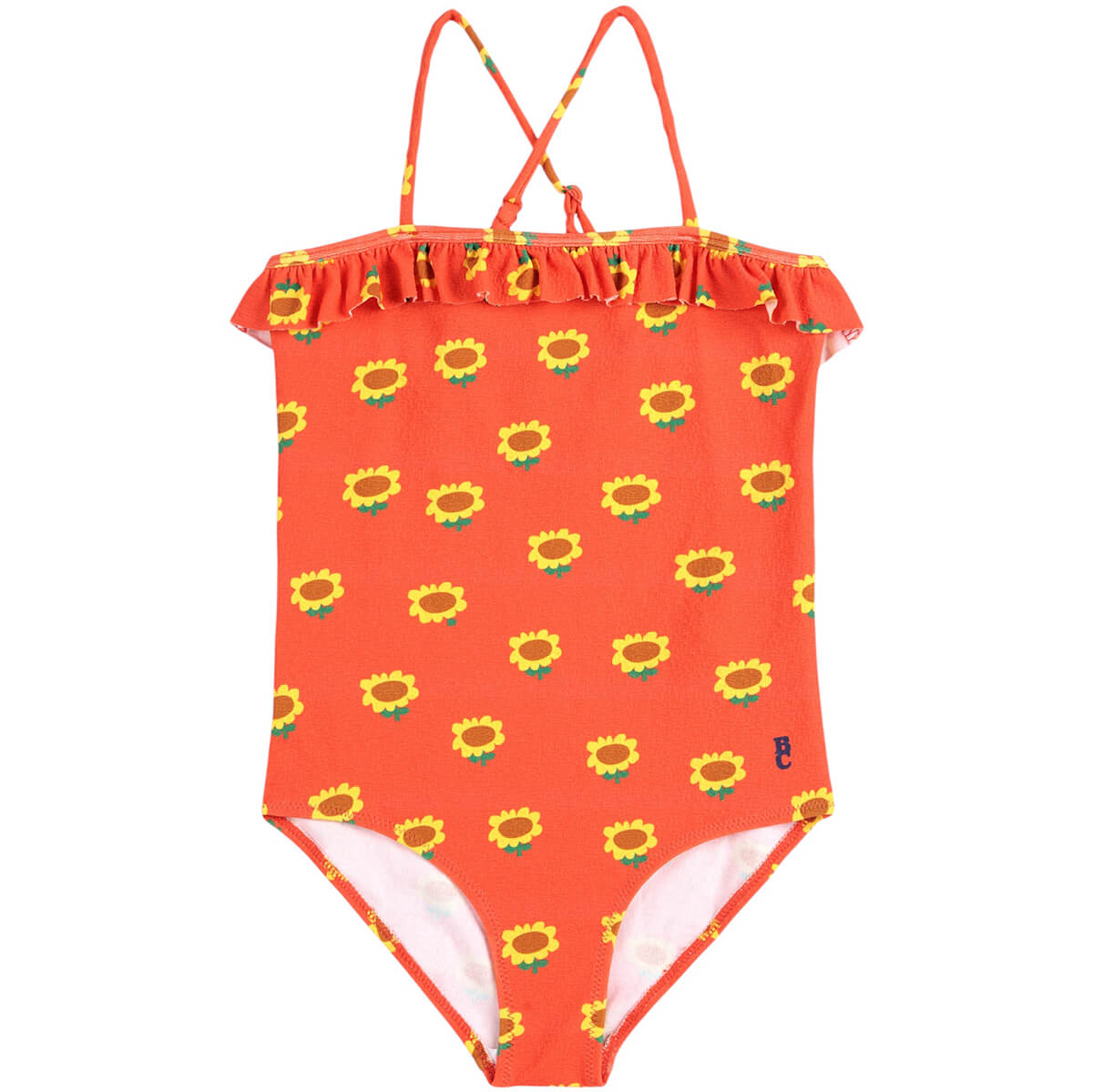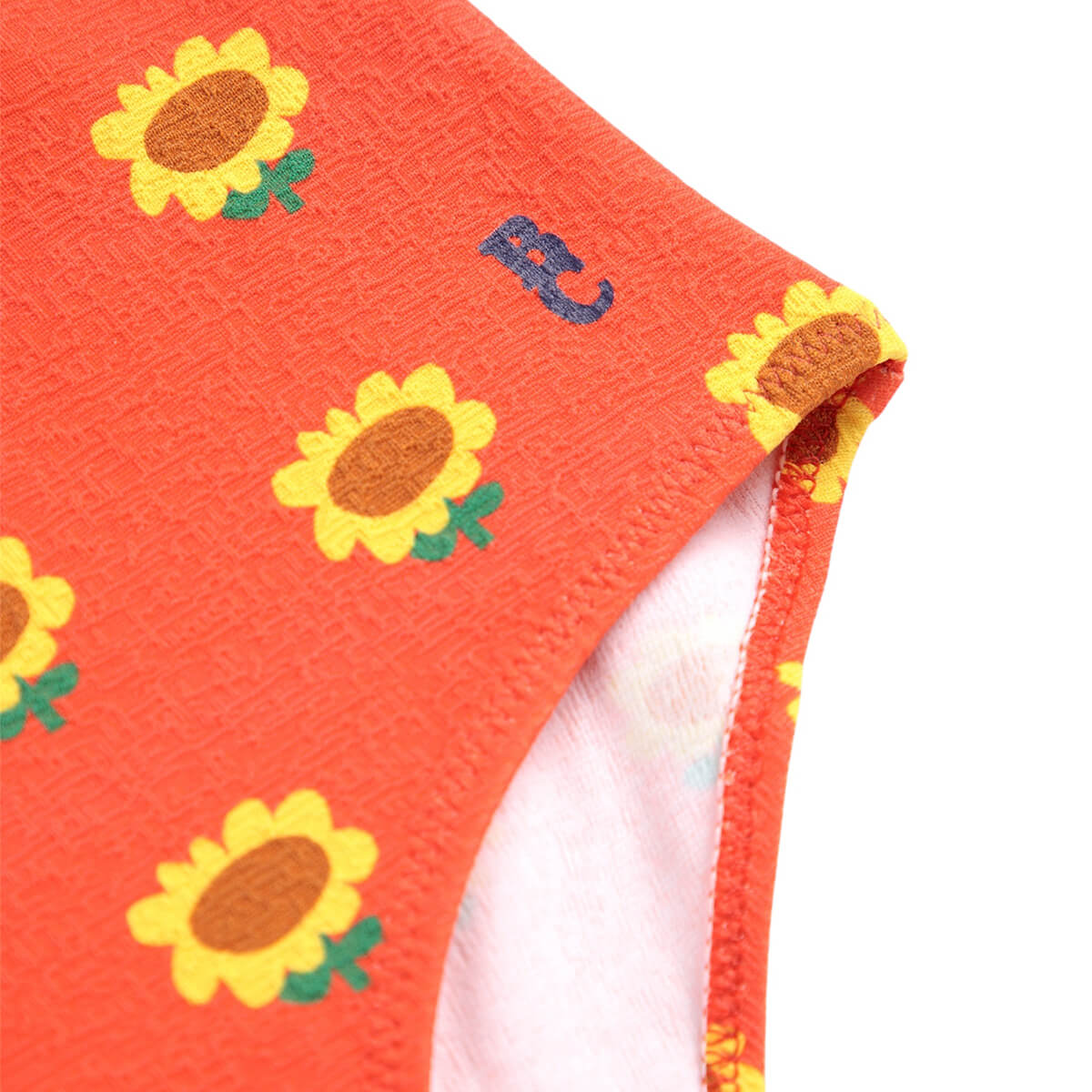 Sunflower All Over Swimsuit by Bobo Choses. Bold and sleek, this red swimwear is a standout for sunny adventures. Made from 89% recycled polyamide and 11% elastane, it features a sleeveless design, a slim fit, and a wide round neck for ultimate comfort. Lovingly made in Spain.