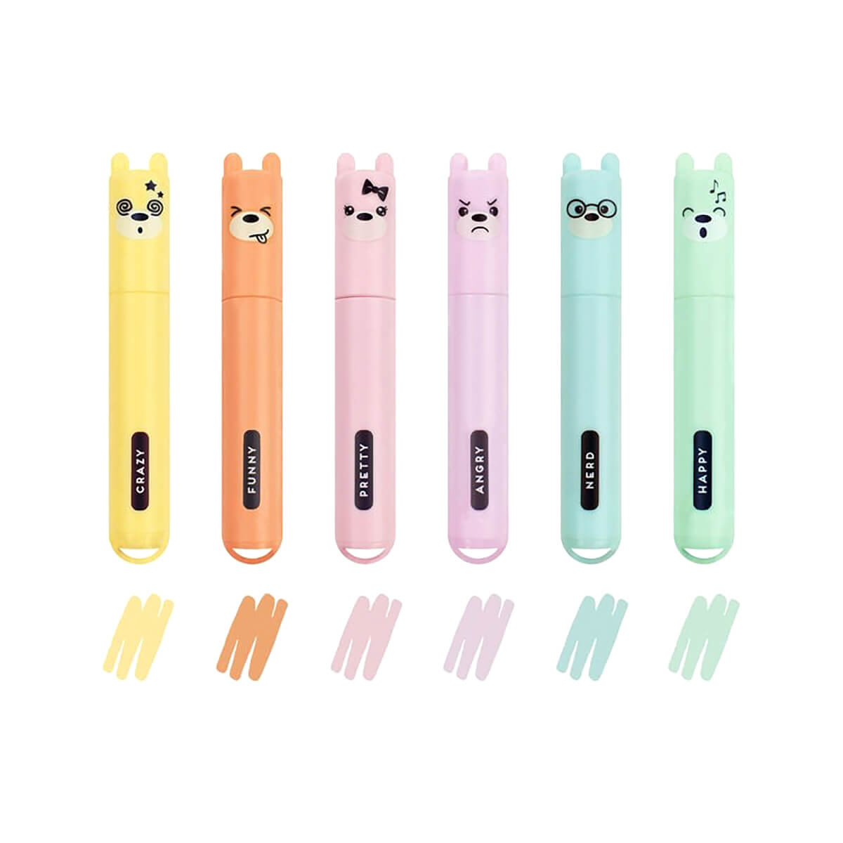 Teddy's Style mini pastel highlighters by Legami. Set of 6 pastel mini highlighter pens each showing different emotions. Consisting of yellow, peach, pink, lilac, light blue and light green highlighter pens, each representing a different mood, you'll have plenty of fun adding colour to your notes.