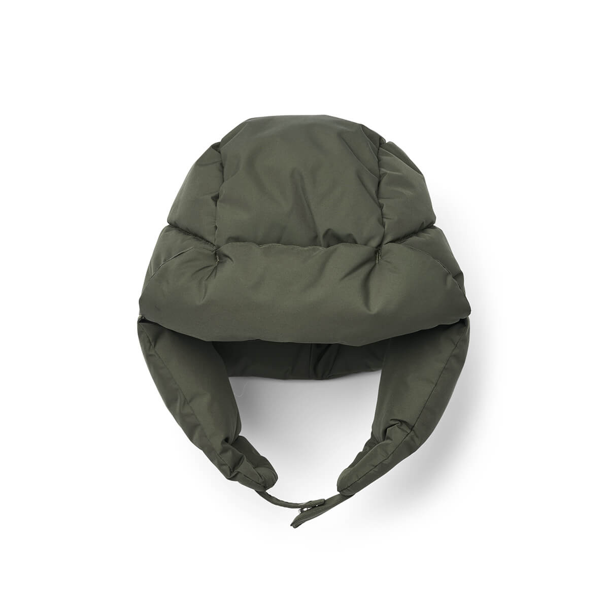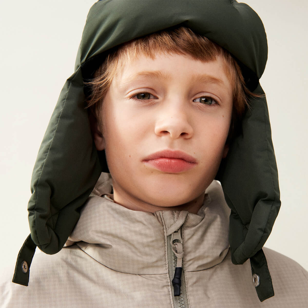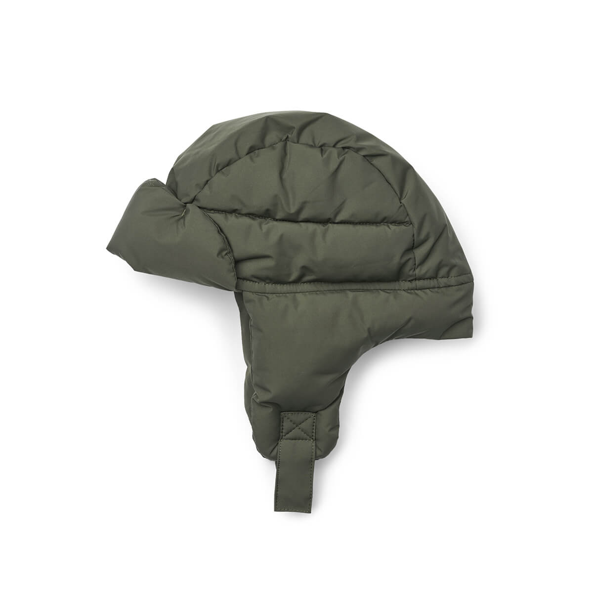 Tori puffer hat by Liewood. This cosy padded winter hat protects ears from the wind and cold. This pilot style hat features a fold up brim and snap closure.