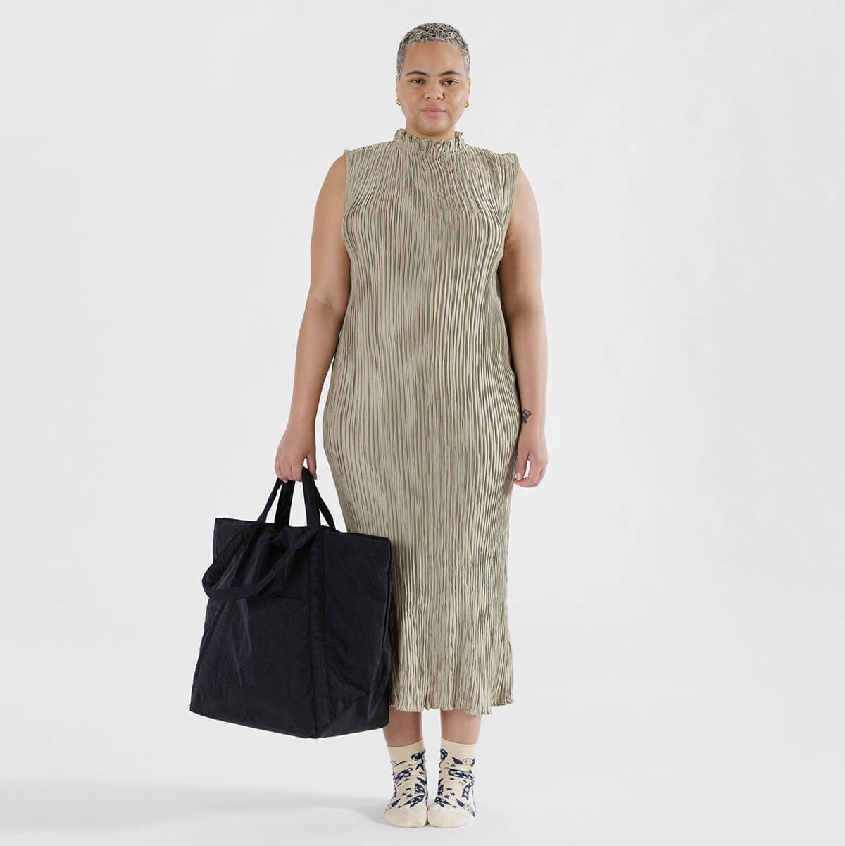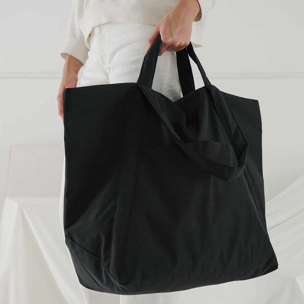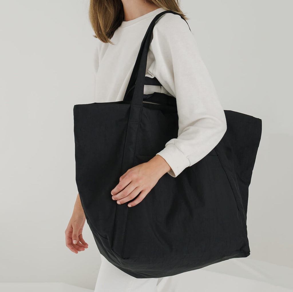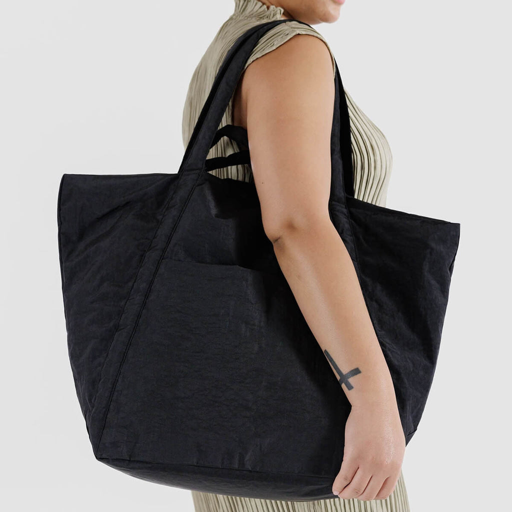 Travel Cloud bag by Baggu.  The biggest of Baggu's Cloud bags, the Travel Cloud Bag fits everything for a weekend away (and more!) yet packs down into nothing. Wear it over the shoulder or pick it up by the handles and let the wind take you away. Top zip closure with an exterior pocket. Packs into its own detachable interior pouch for easy storage. Unlined.