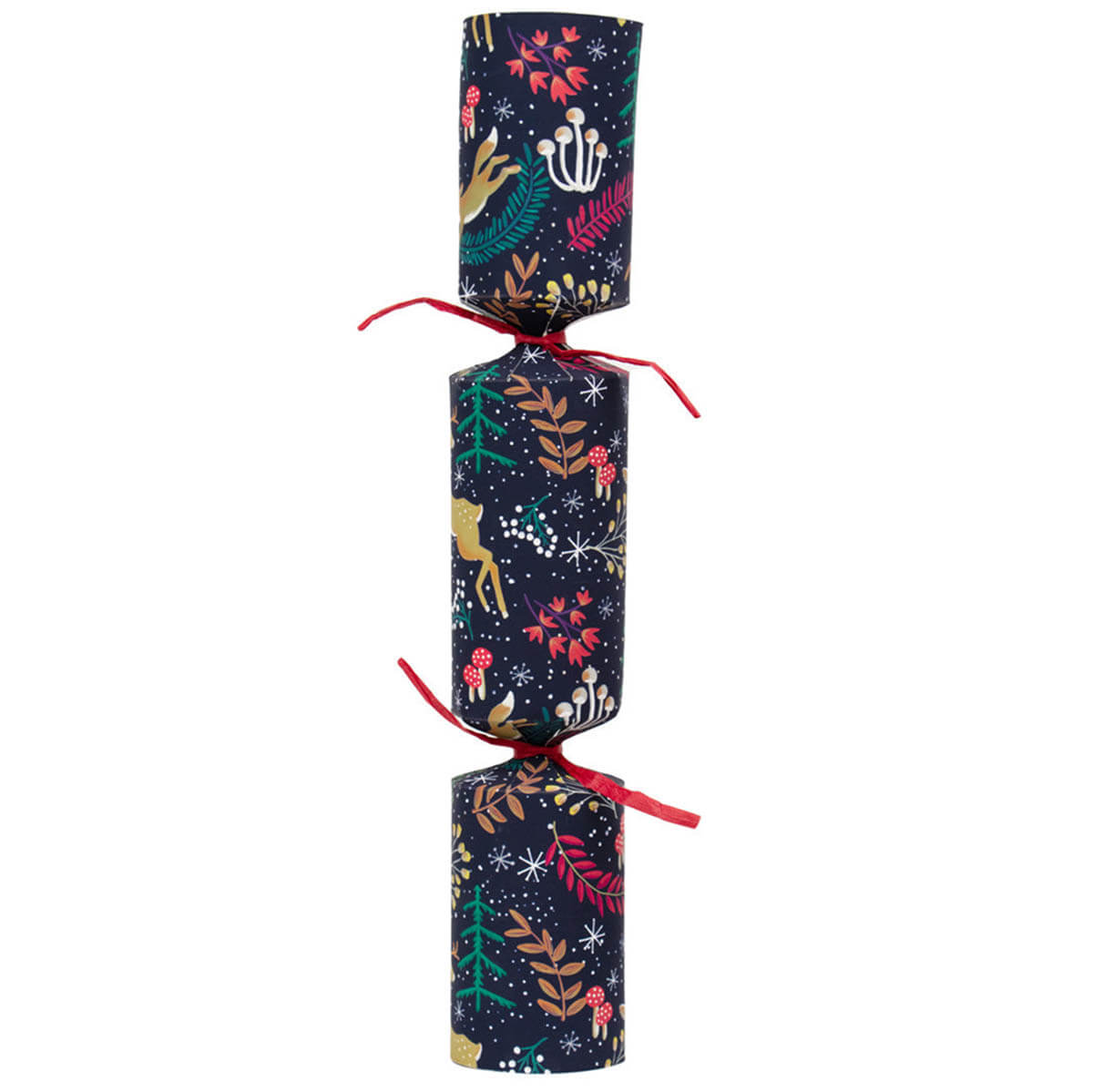 Twilight Luxury Christmas Crackers by Talking Tables. Christmas crackers featuring a Twilight design, evoking Indian folk art with hand painted forest animals, flora and fauna, and jewel tones. The crackers are handmade from FSC sustainably managed forests and completely plastic free, meaning they can be recycled at home.