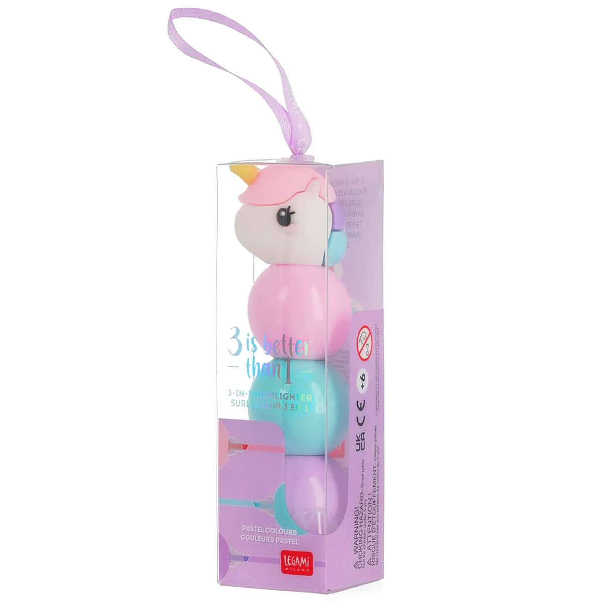 Unicorn 3 in 1 Highlighter by Legami. Novelty set of three stacking highlighter pens in pink, light blue and purple. Chisel tips. Quick drying water-based ink.